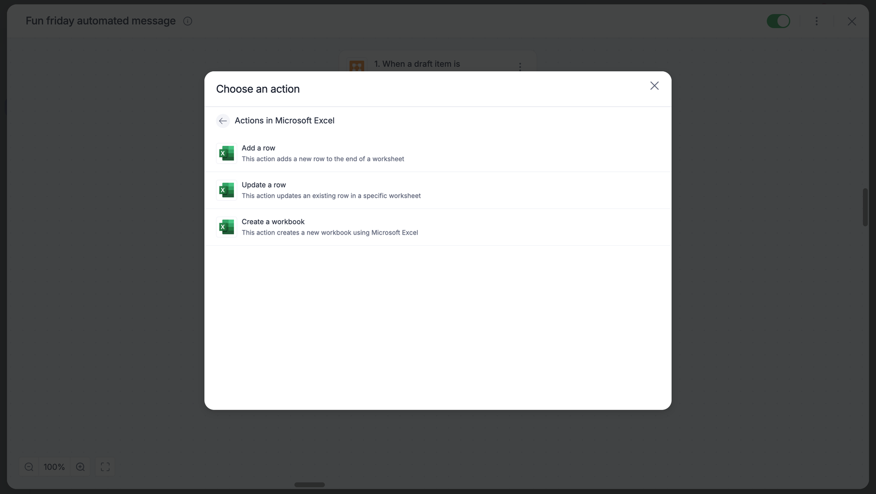 After creating a custom workflow with your Microsoft Excel connector's action steps, switch on the toggle button to activate the integration run. Once a trigger event occurs, the selected Microsoft Excel action is activated. Depending on the action you choose, values will be added or updated to the Microsoft Excel spreadsheet, or a new spreadsheet will be added to the account.