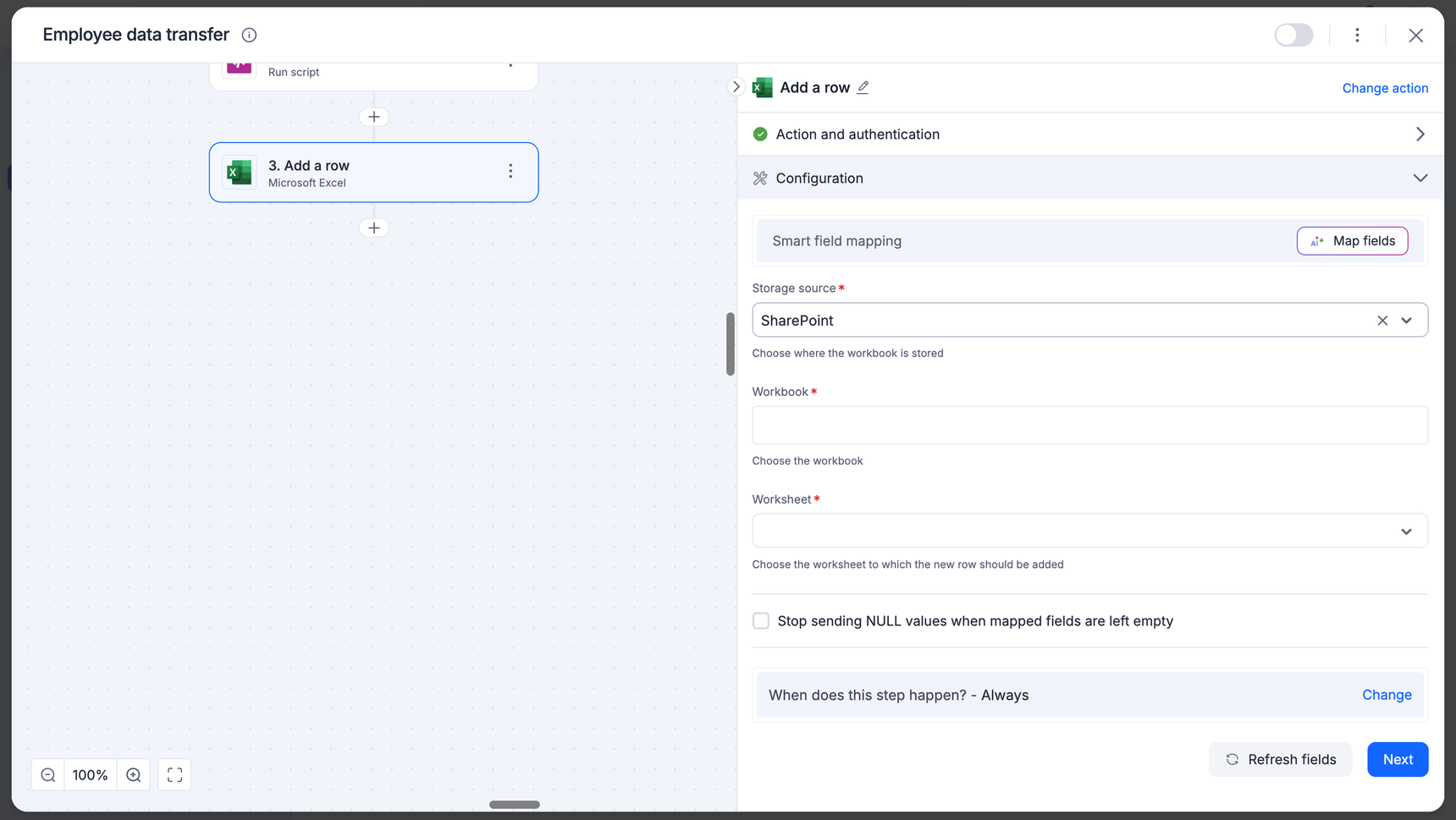 - After authenticating with your Microsoft account, add relevant values against the Microsoft Excel form fields. You can hit Refresh fields to view all the updated fields in the selected Microsoft Excel form. Map Microsoft Excel fields from your trigger step or fields from your previous action steps. These values will be automatically added to item fields after the action is executed. Click Next.