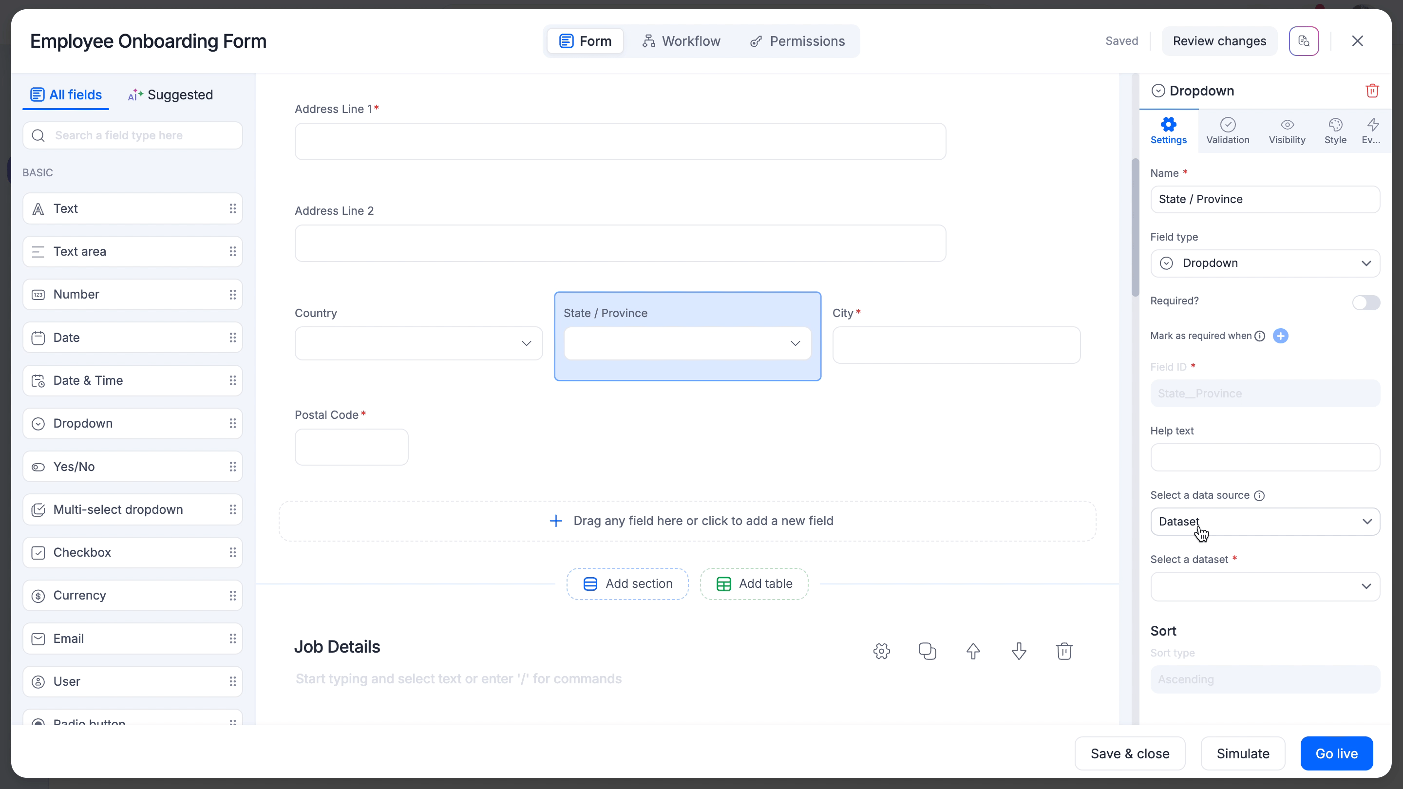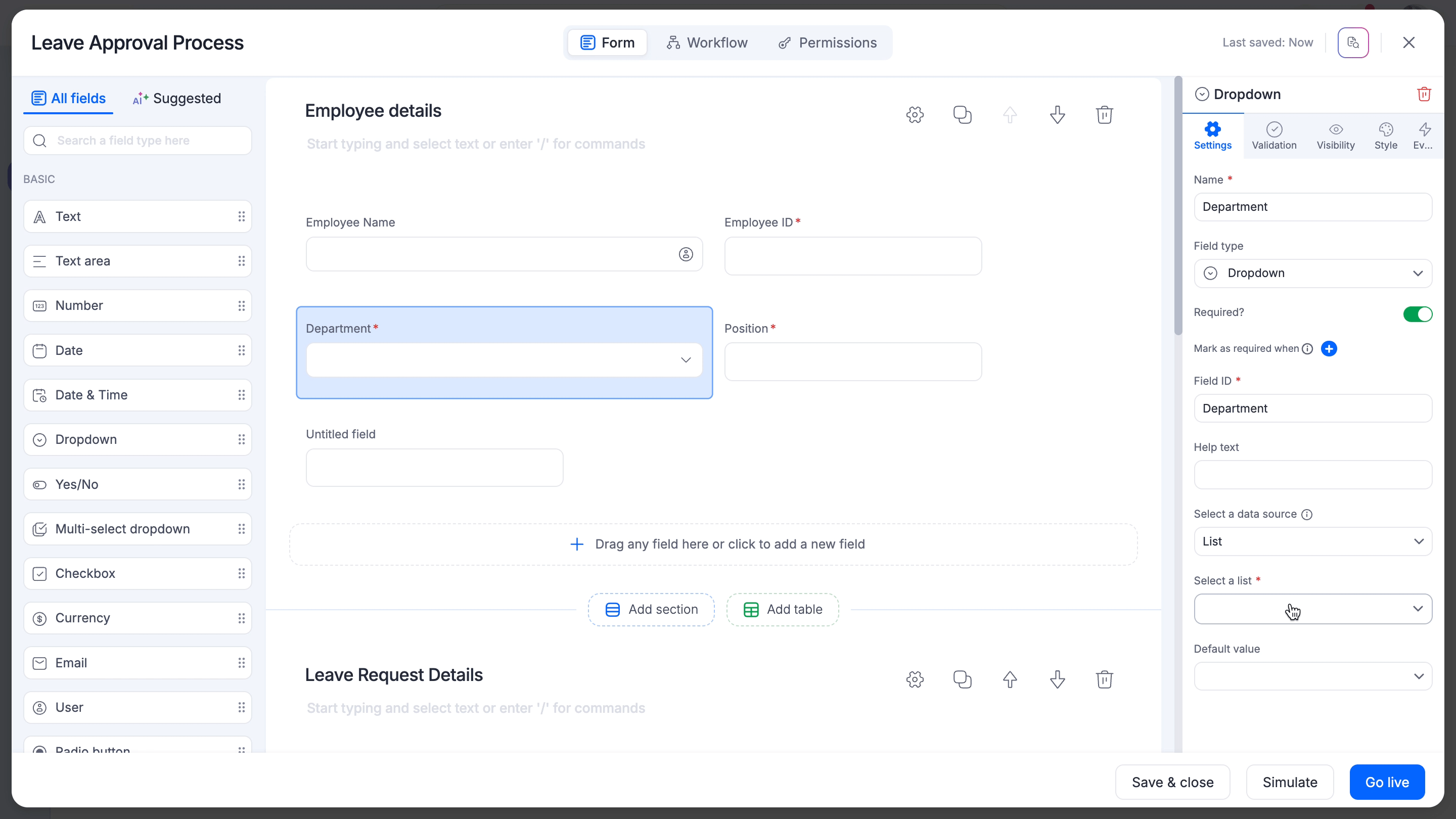 The dropdown field allows users to select one option from a set of values in the form, sourced either from a list or a dataset field.