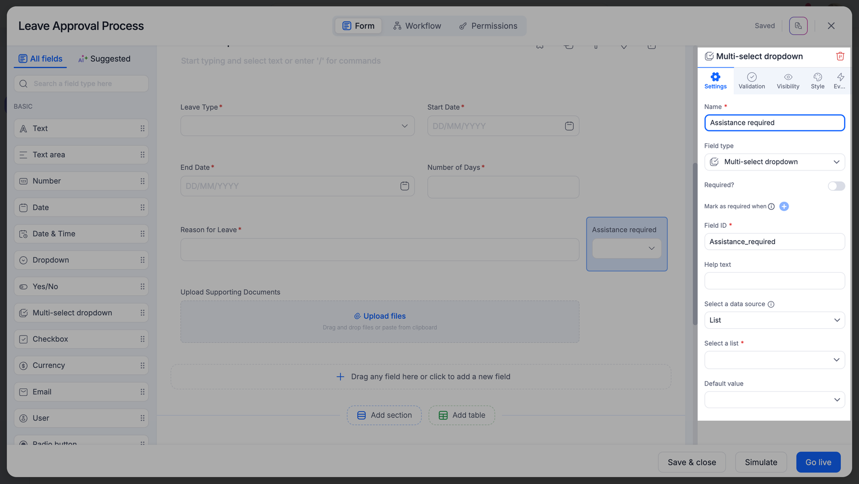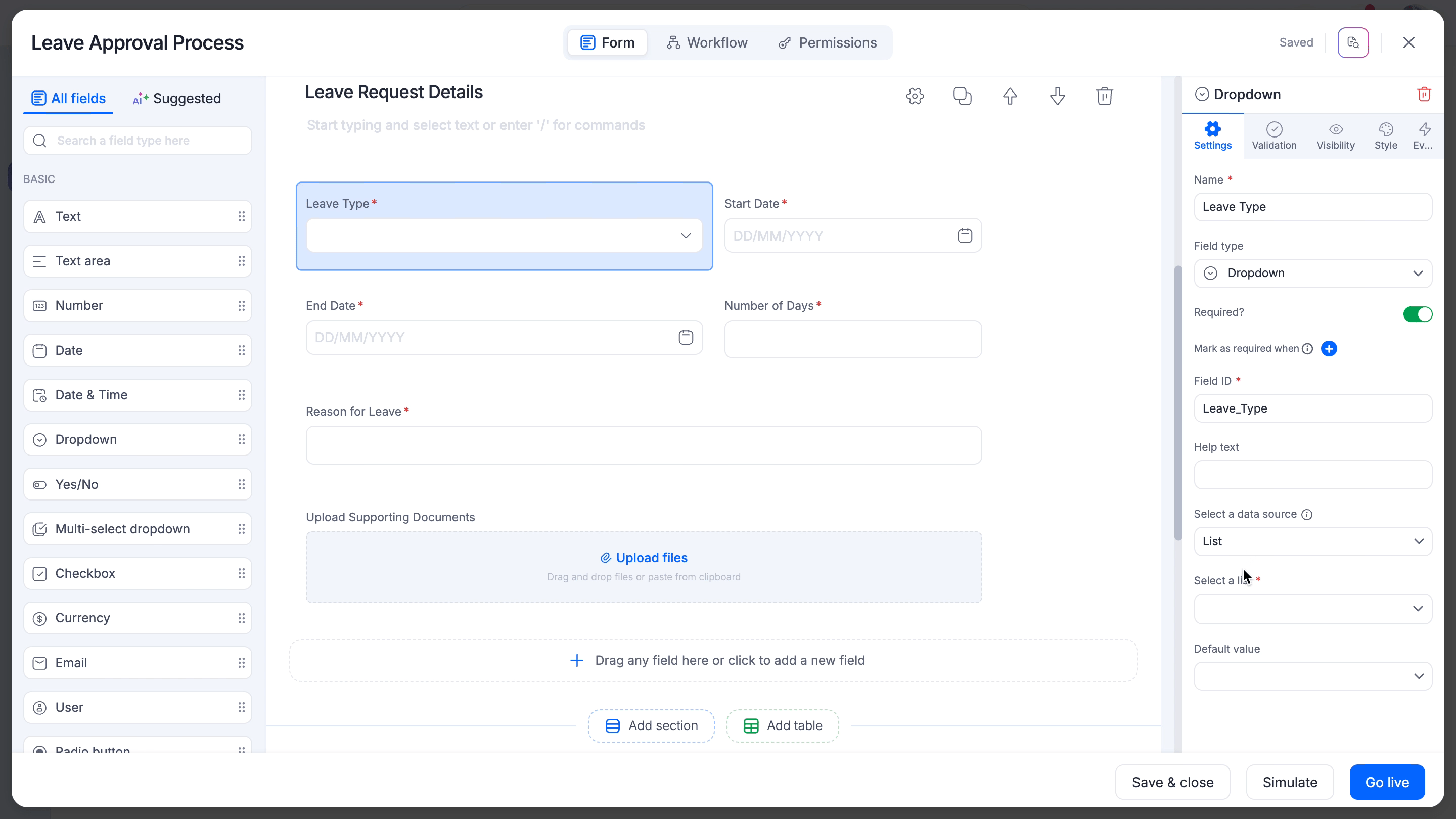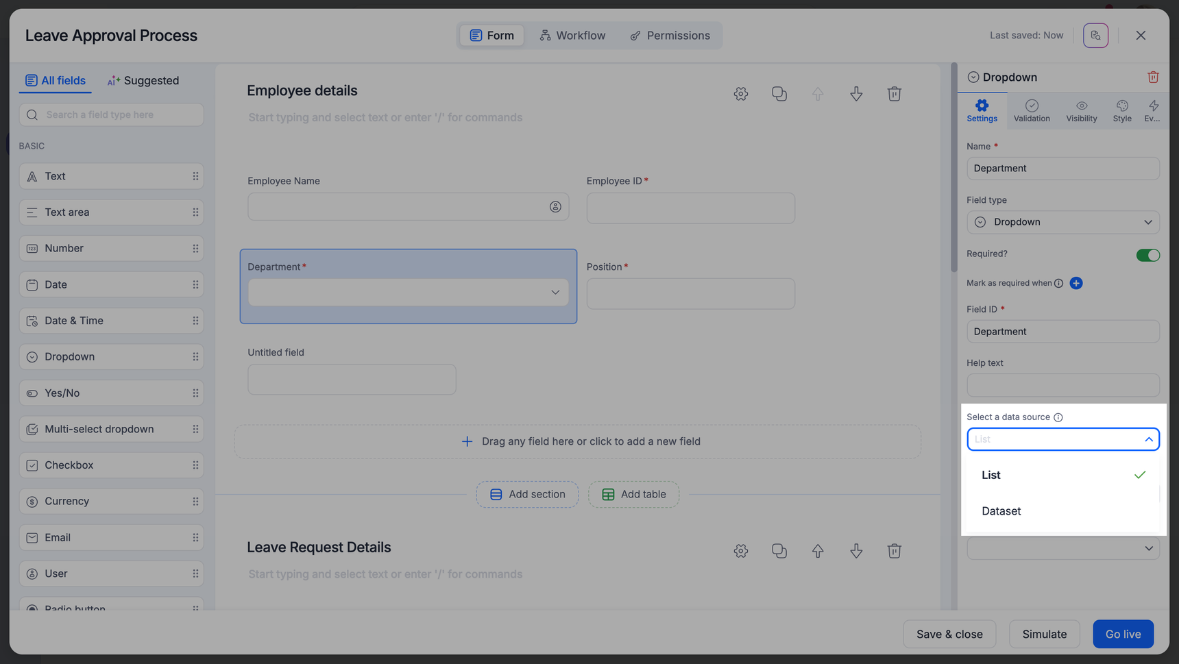 You can load the dropdown from a static list or a dataset field based on your needs. Choose a List or a Dataset as your preferred data source under the Select a data source field. If you are unsure which data source will suit your requirements the best, refer to this document to learn more.