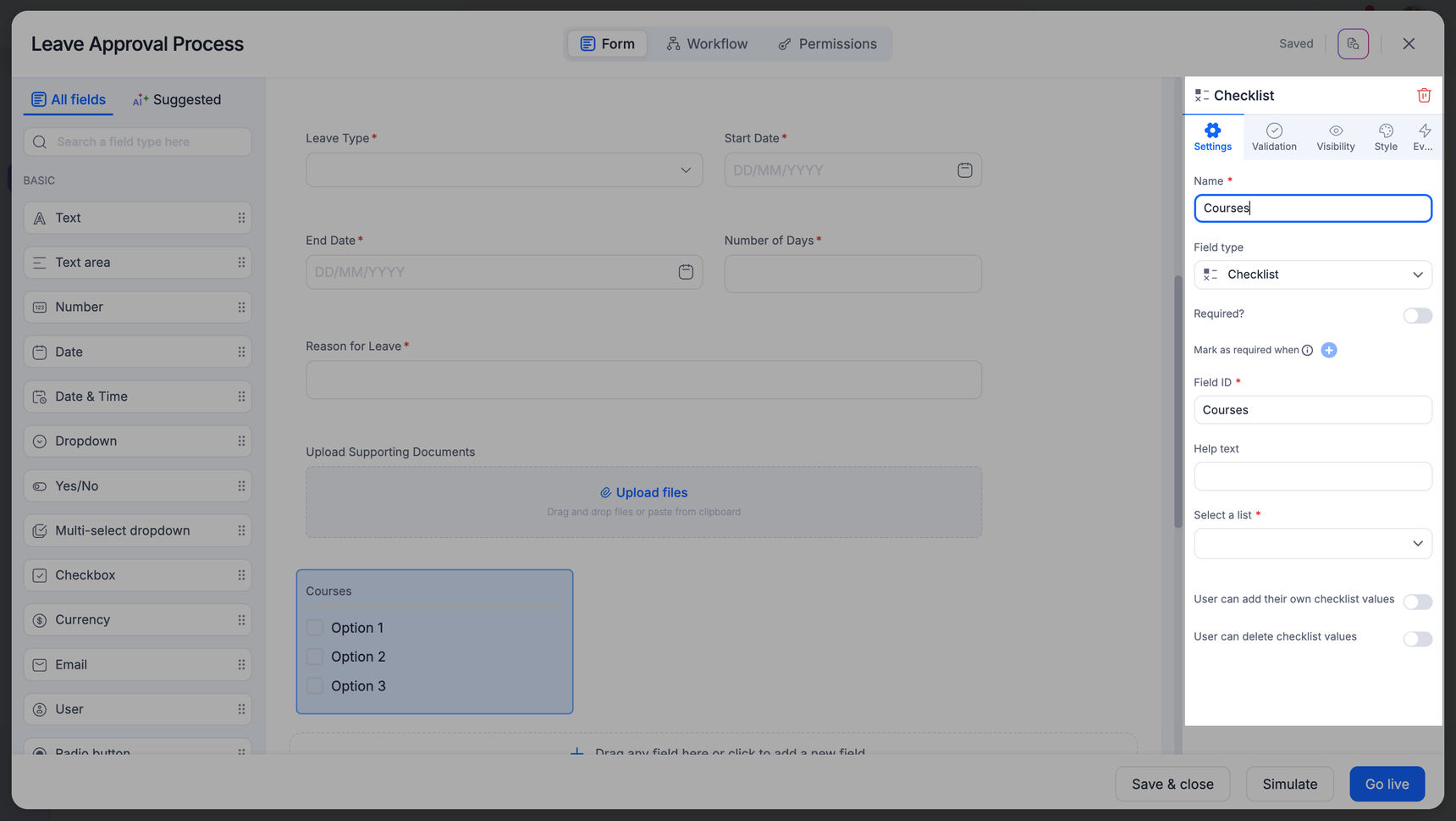 Enable the Users can add their own checklist values option to let the form users add values of their choice to the list on their forms. However, the values added by them will not be added to the primary list. Similarly, you can enable the Users can delete checklist values option to let them delete a few checklist values as necessary.