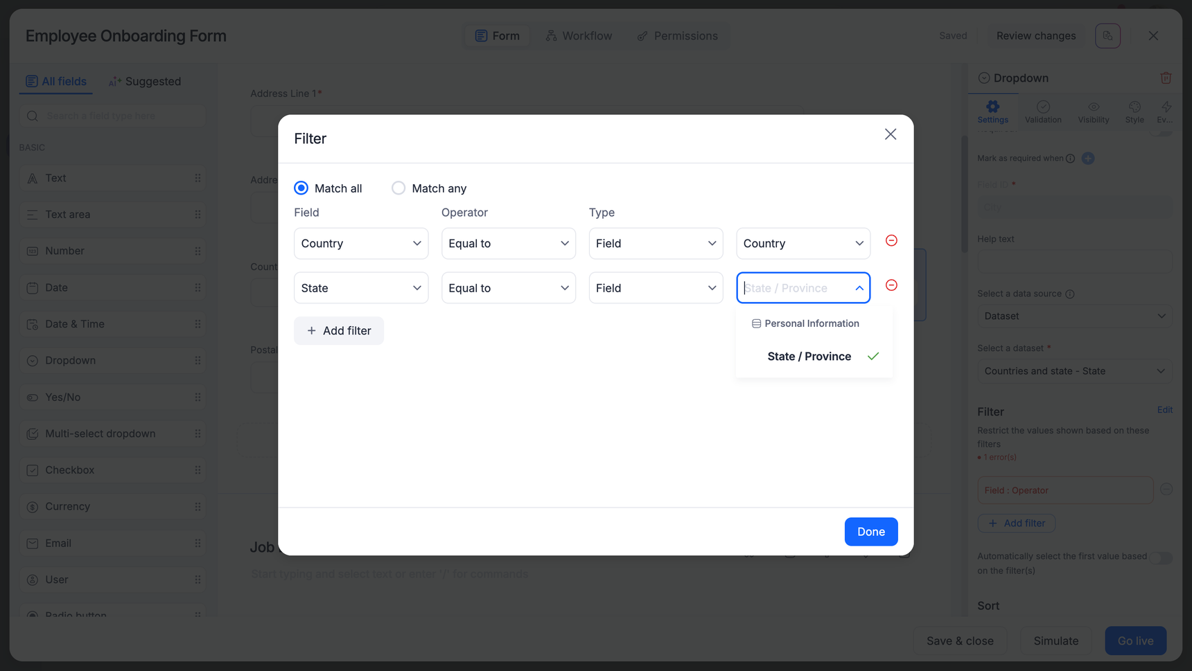 - Search for the Countries and state dataset and select the State field. The following screen recording is an example of how the State dropdown will list the states belonging to the country the user chose in the form.