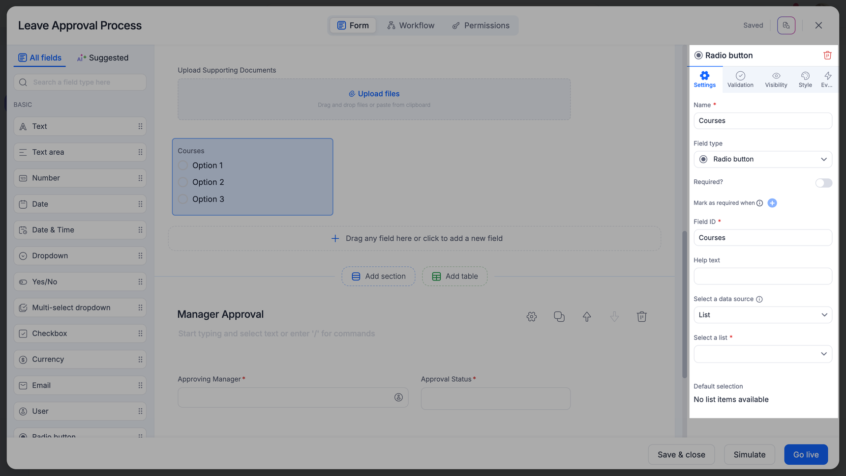 The radio button field allows users to select only one option from multiple choices. Like dropdown, multi-select dropdown, and checkboxes, you can source the values for this field from a list or a dataset. The radio button field values are shown as clickable options on the form. In contrast, the options in the dropdown field are only visible after the user clicks the field.
