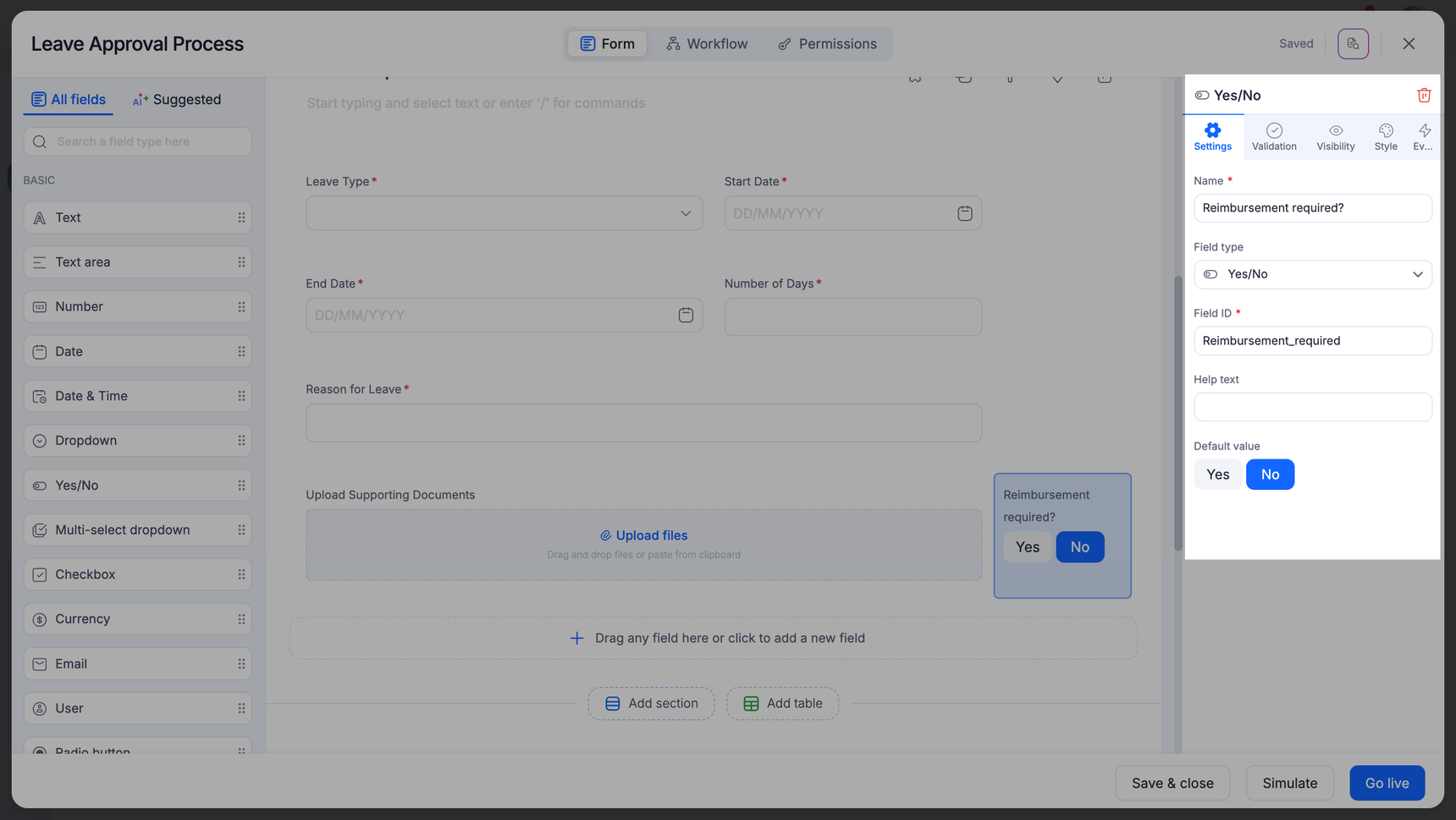 You can set a default value for the radio button field by selecting a suitable option under Default selection. You can also unselect the default selection using the Reset option.