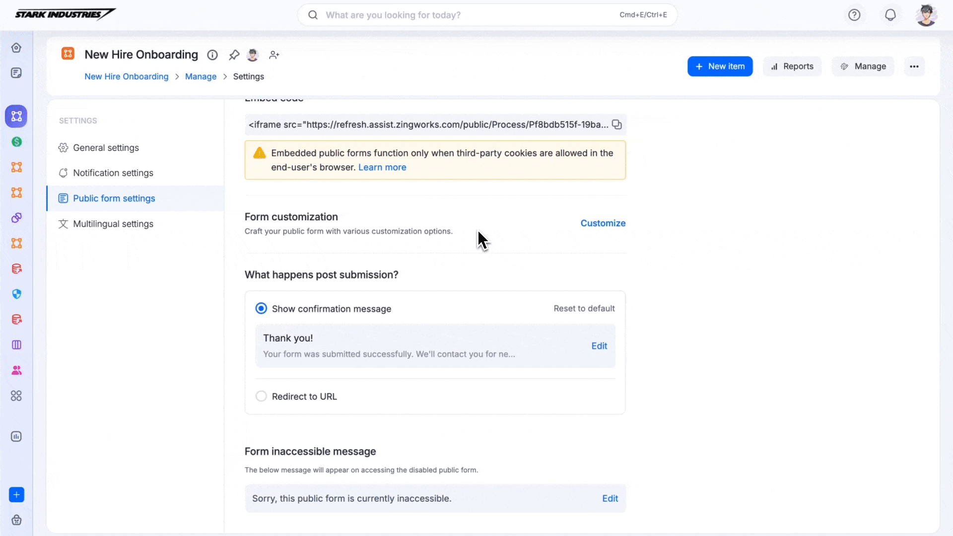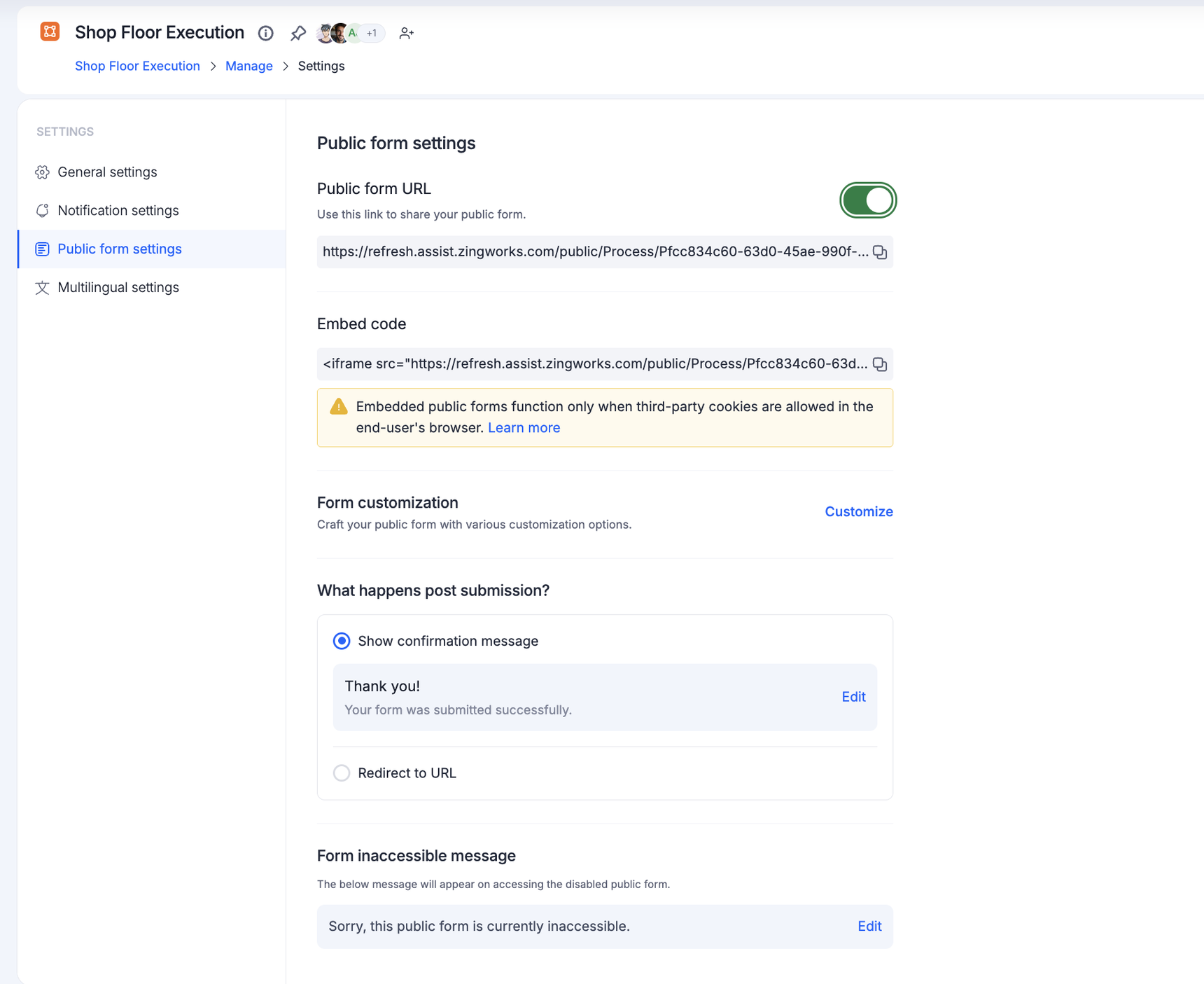 - Turn on the Public form URL field and copy the link to share it with anyone outside your organization. You can also embed the public form in any website so that an external user can access it from elsewhere and submit their details to Kissflow.
