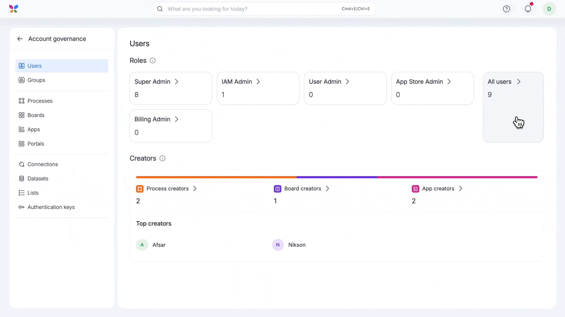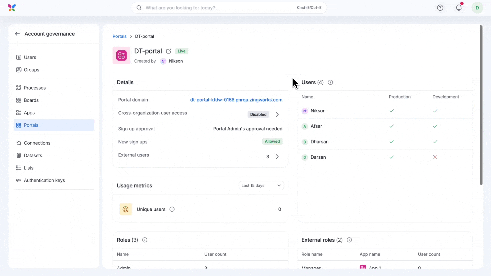 Building on the foundation of account governance, this feature enables Super admins and IAM admins to monitor a live portalโs connections, user roles, data access, deployment history, and more, all from a single place.