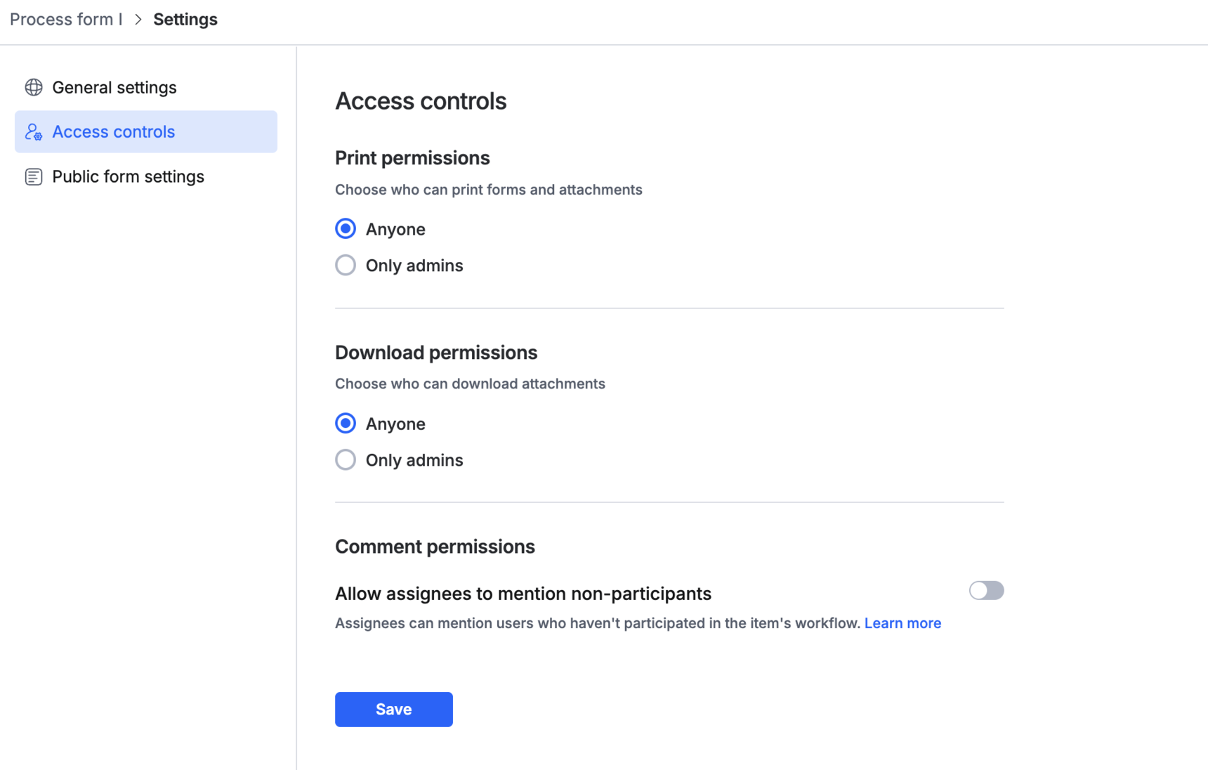 Setting the permission to Anyone would allow any user to download attachments or print forms. Choosing Only admins would restrict download and print permissions only to admins.