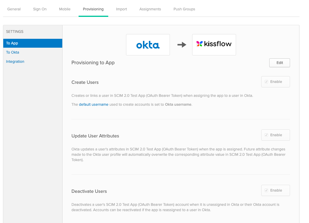 - You can click Edit beside Provisioning to App to enable Create Users, Update User Attributes, and Deactivate Users capabilities.