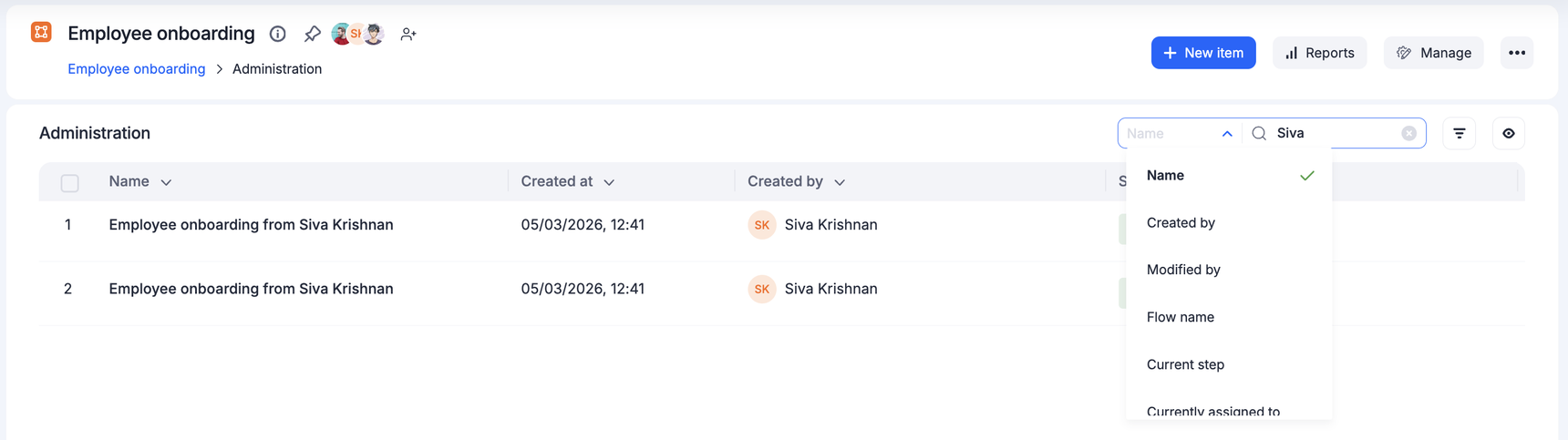 You can use the search bar to find items quickly. The drop-down beside the search bar will list all the fields in the process from which you can select one. After you input a value in the search bar, all the items whose selected fields match with that value will be listed.