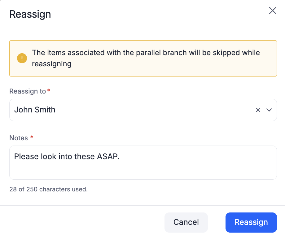 Also, the items that have already been completed, rejected, or withdrawn will be skipped or not considered for reassignment. i.e., only items in In progress status will be reassigned, and the items skipped will be prefixed by a yellow exclamation mark for your understanding.