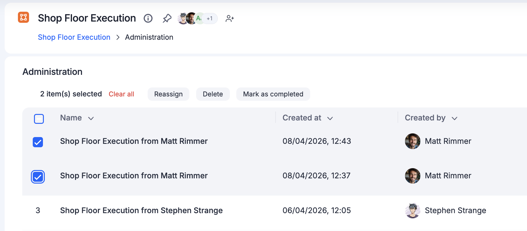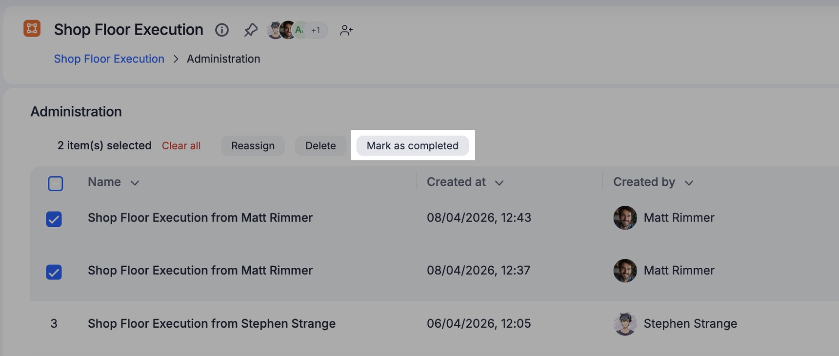 You can reassign items, mark them complete, or delete them as necessary. To perform these actions, navigate to your process and click the More options button () > Administration. You will see a list of all the items in your process.