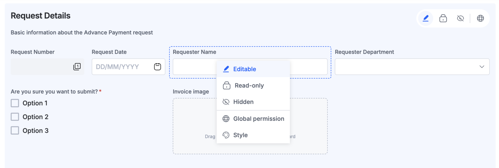 If you want to set the permissions for a field or section across all the steps, you can click Global permissions. This will open up a pop-up that will let you quickly assign the permission for the field at every step. This is often very useful when you add a field into a process and want to quickly assign permissions without clicking through each tab on the left.