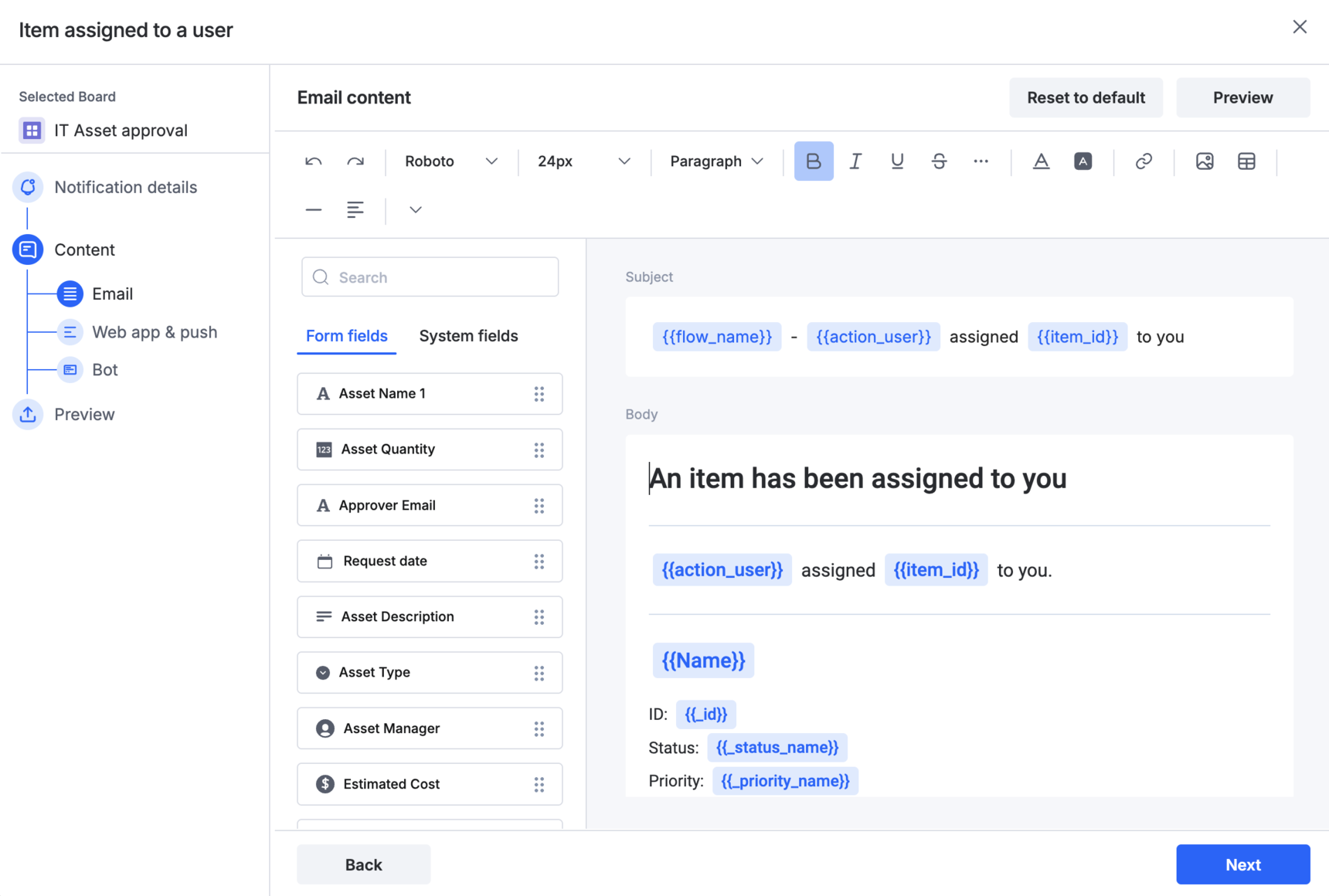 - Email content is for email notification channels where you have a large space to convey information comprehensively and provide more details for recipients to understand the notification fully.
