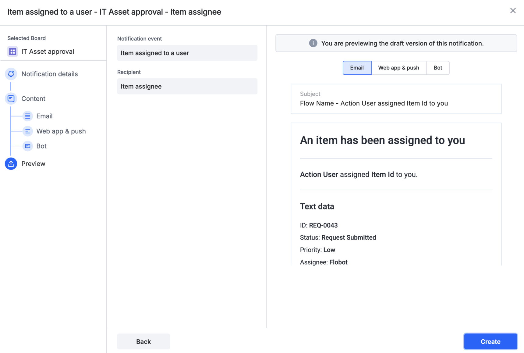 5. Preview - Have a preview of the notifications, and click Create. In the pop-up that appears next, you can choose to change the system-generated notification name and give a desired name.