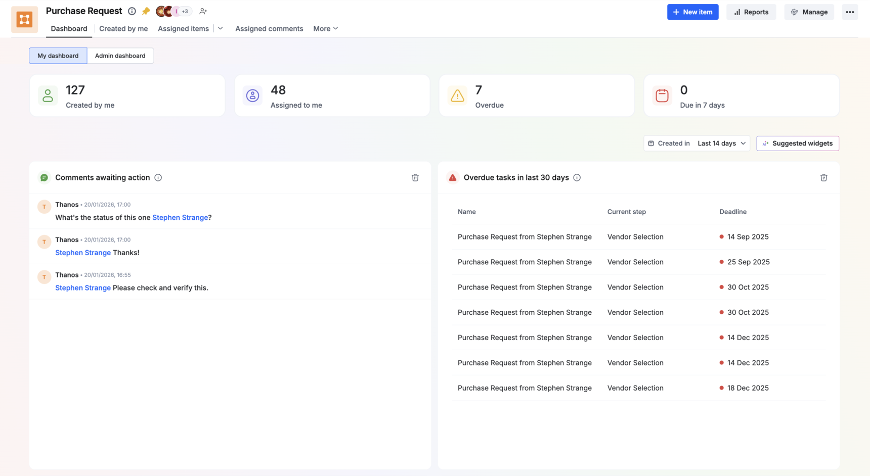 The process dashboard provides actionable metrics to monitor how efficiently each process runs. Itβs ideal for both process admins and users as it highlights stuck or delayed items, average handling times, and patterns that affect throughput.