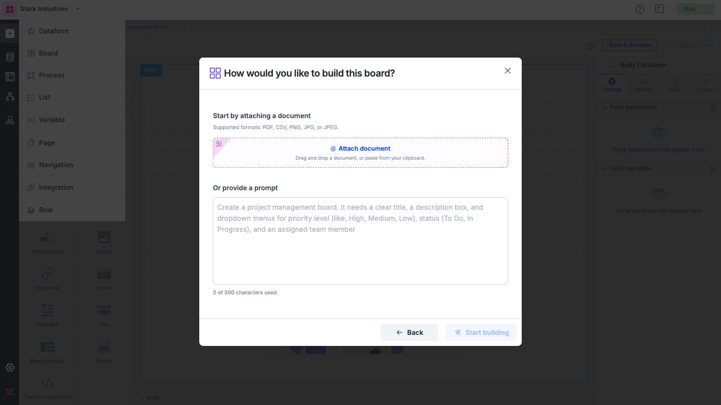 Simply describe how you want your board to function in the Or provide a prompt space, and click Start building.