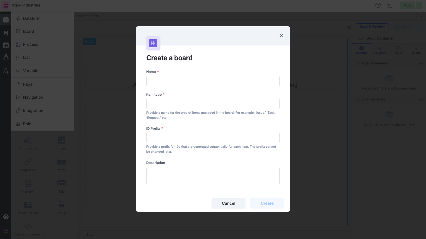 Forms let you define the data necessary to move an item through your board. They are made up of sections, fields, and tables.