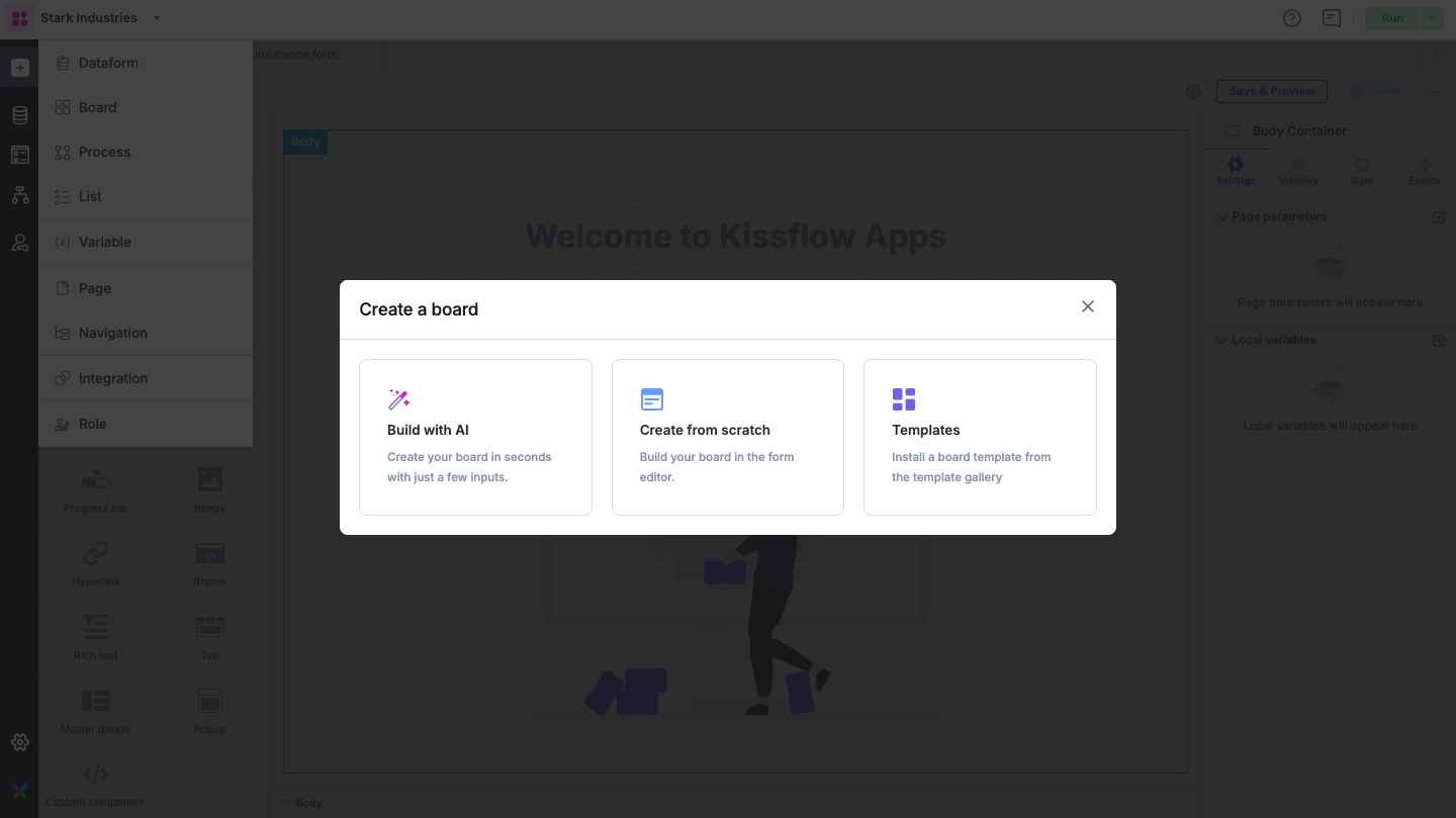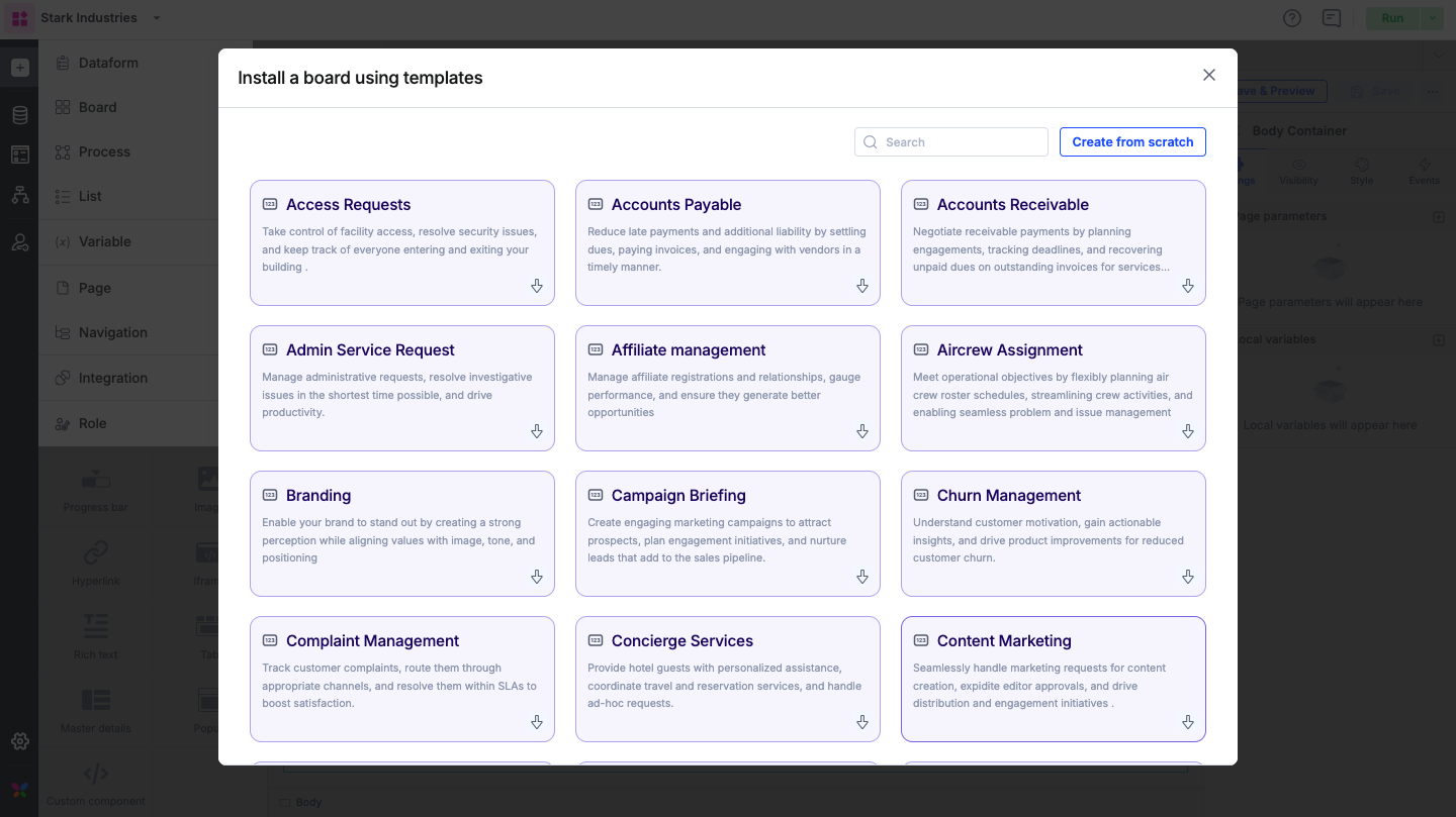 Click Board under the Quick create menu on the left. You have three options: Create from scratch, build with AI, or use a template.