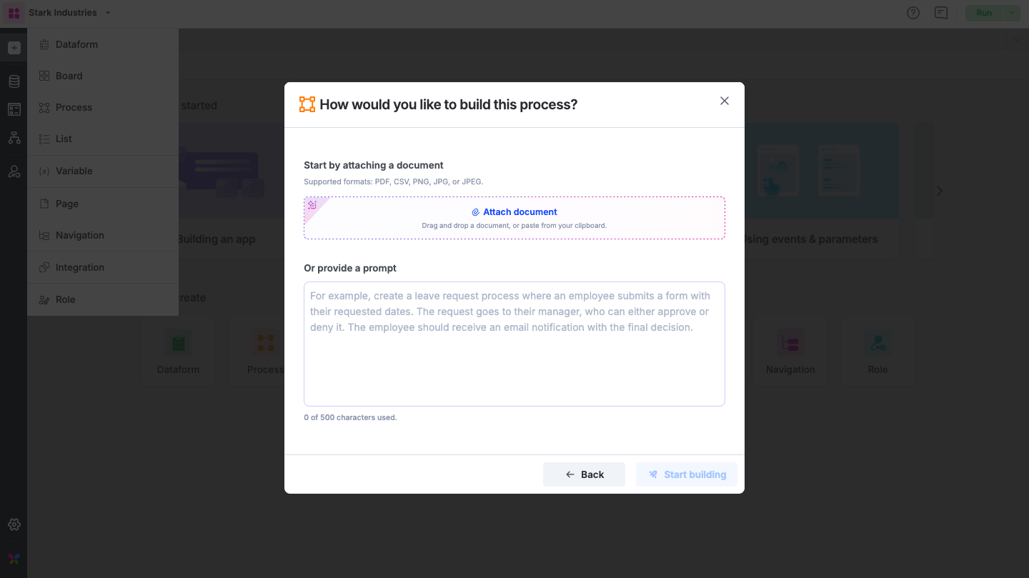 Here again, you can either attach a document to create your process or enter a prompt.