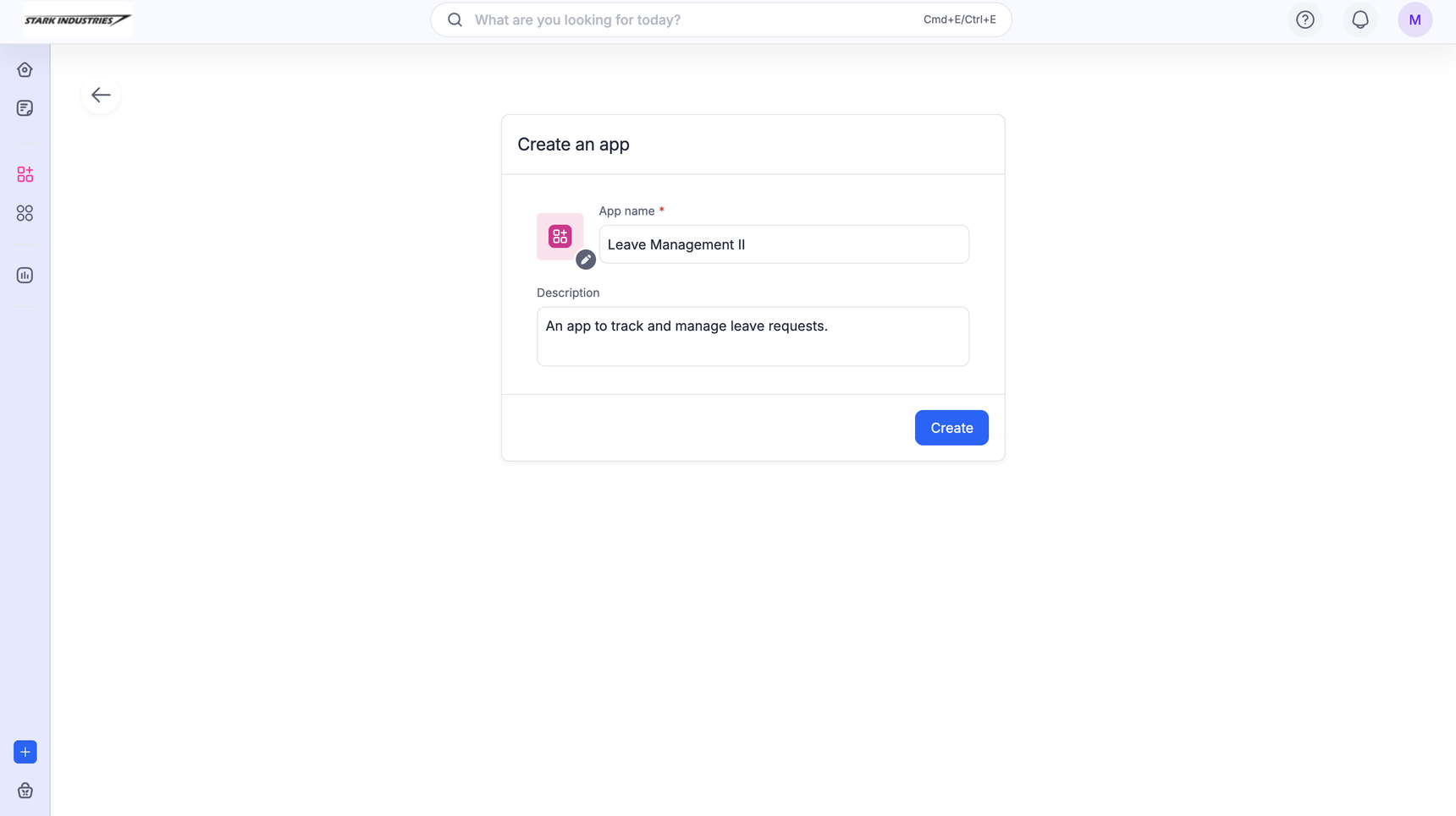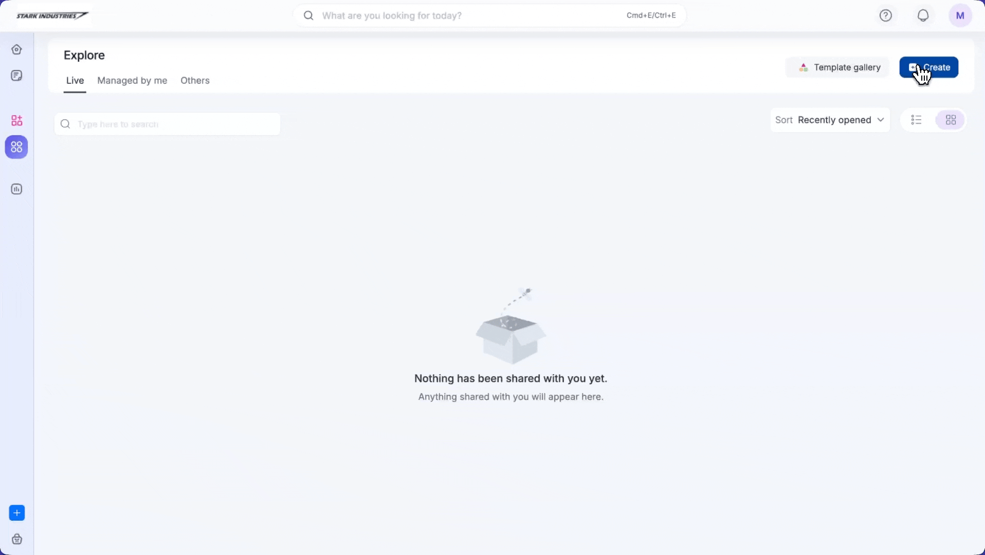 - Click the Create button in the left navigation bar and click App. Alternatively, click the Explore button > + Create to open the Create from scratch menu.