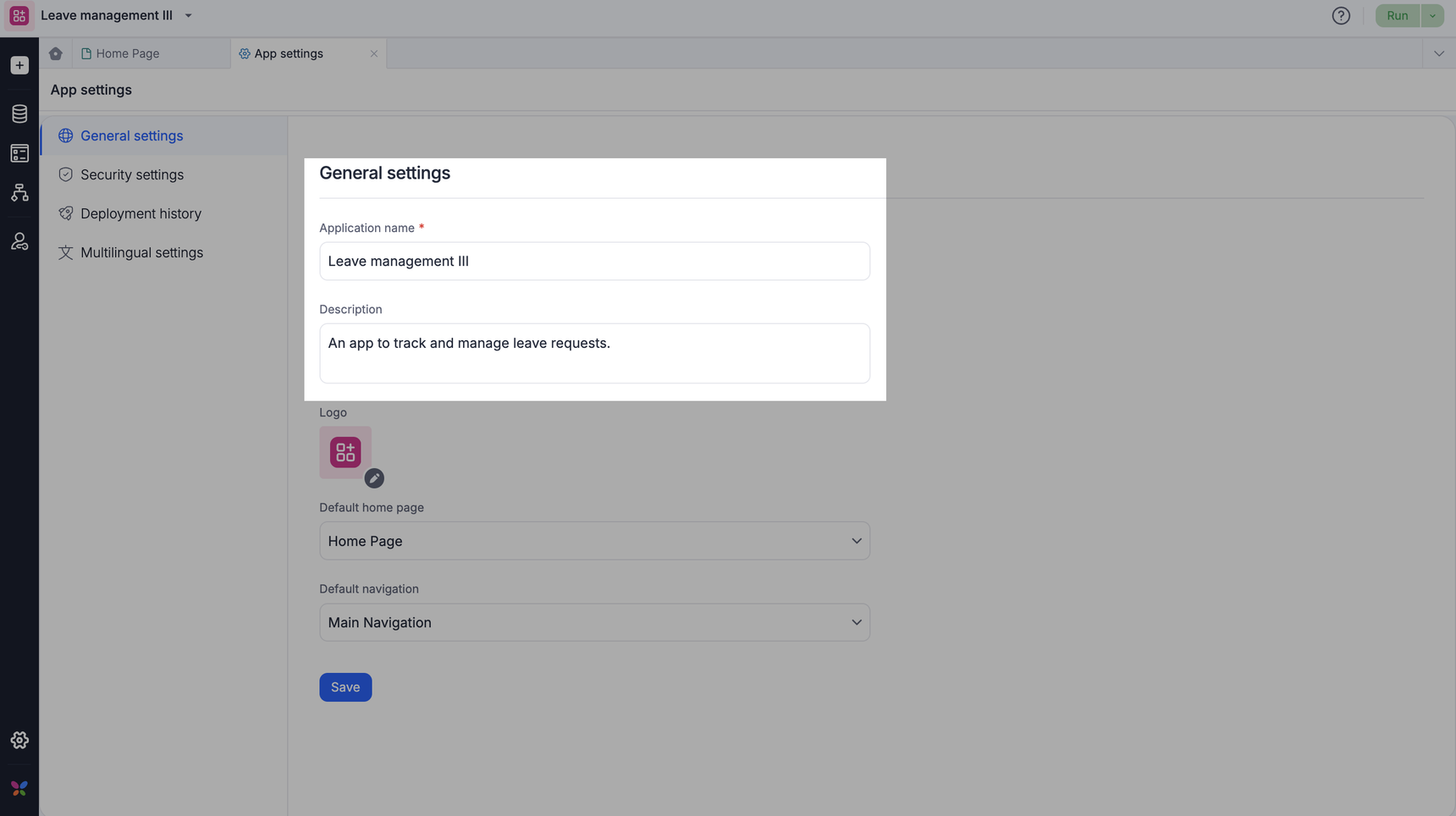 To rename your app in the app builder, click the Settings icon in the bottom left corner and go to App settings > General settings, update the current name and description, and click Save. Alternatively, click on the app name in the top left corner and type in a new name.