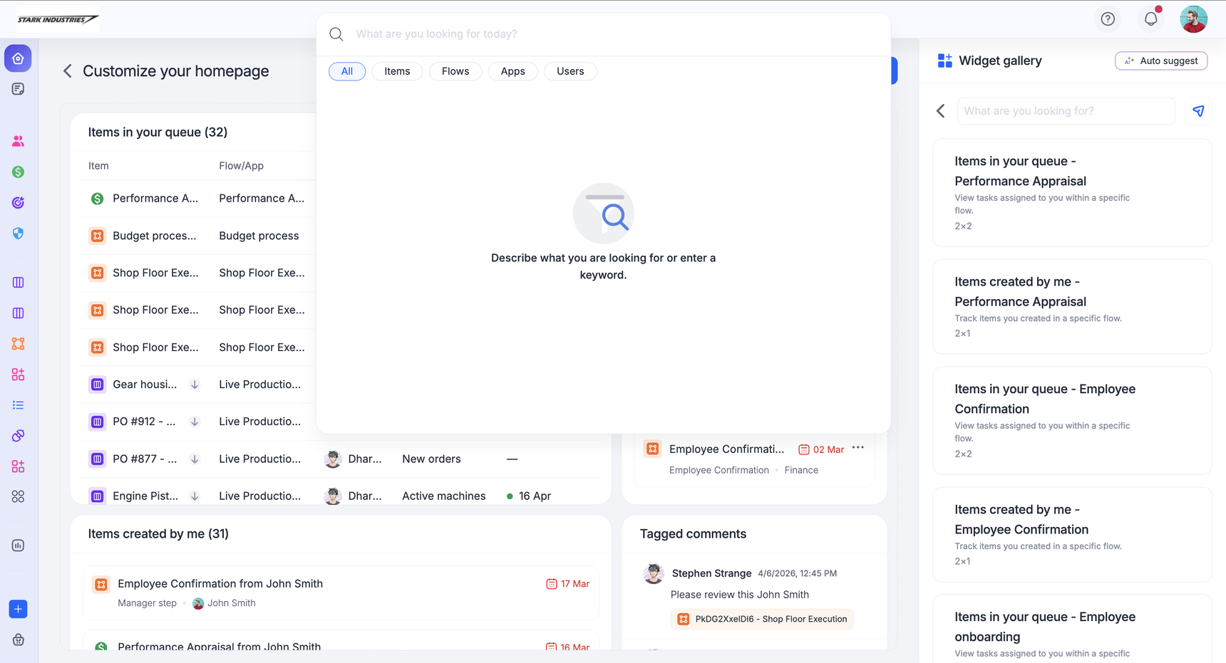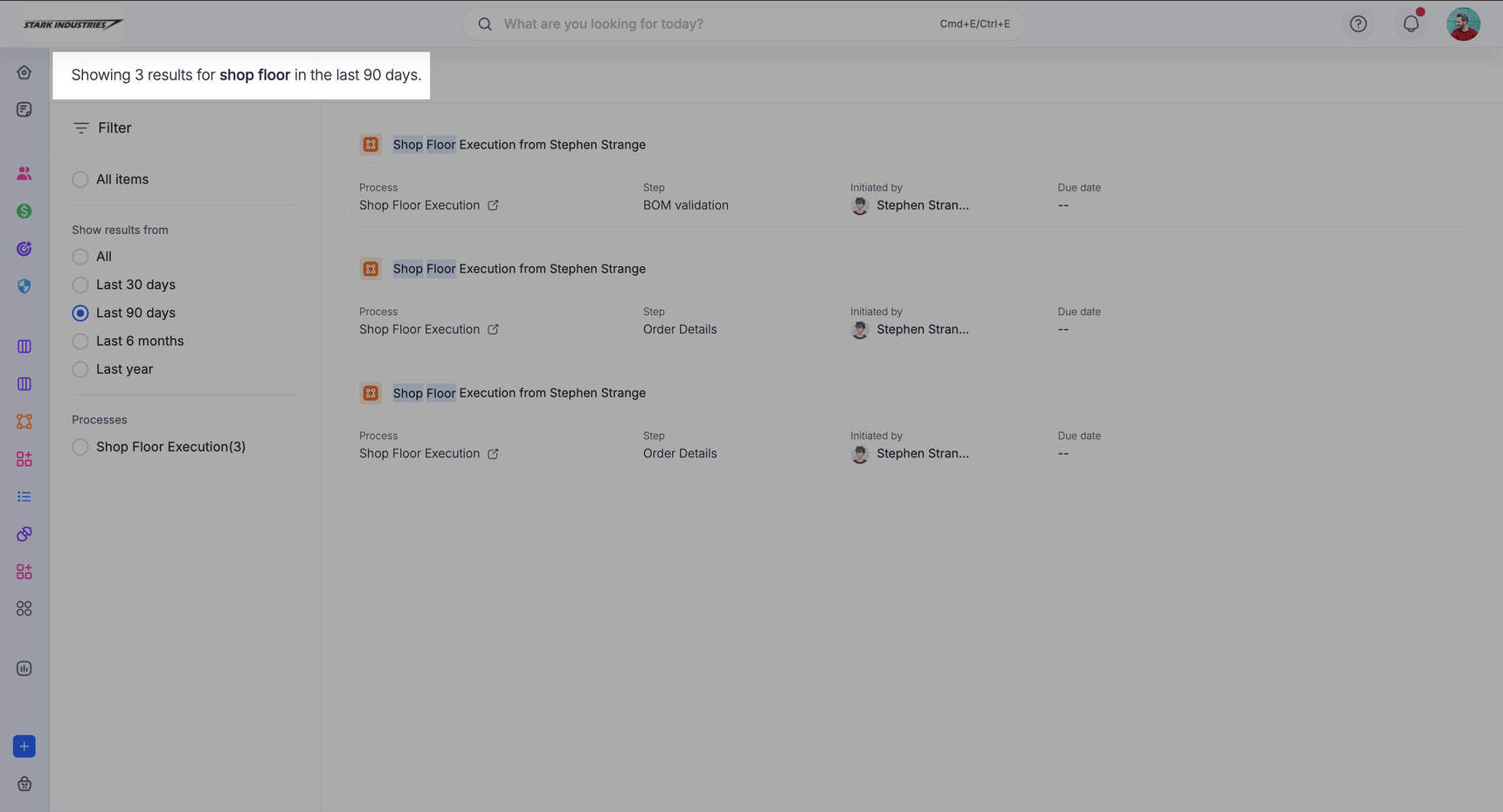 The global search gets you to where you want to be in the product. Be it workflows, or even specific items, describe what you are looking for or type a keyword and get to your target workflow quickly. You can also search for users in your account.