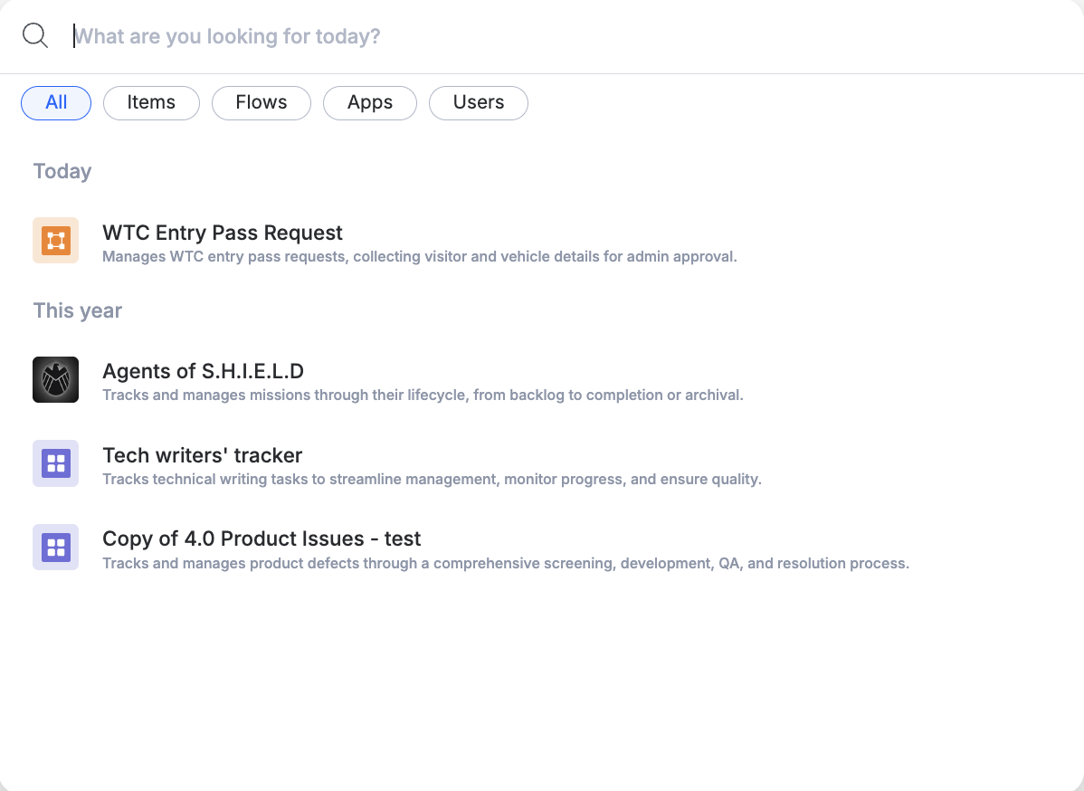 You can filter your search results by Items, Flows, Apps, and Users. These filters help you narrow down results and take you fast to target, especially, when your account is large or a complex workspace.