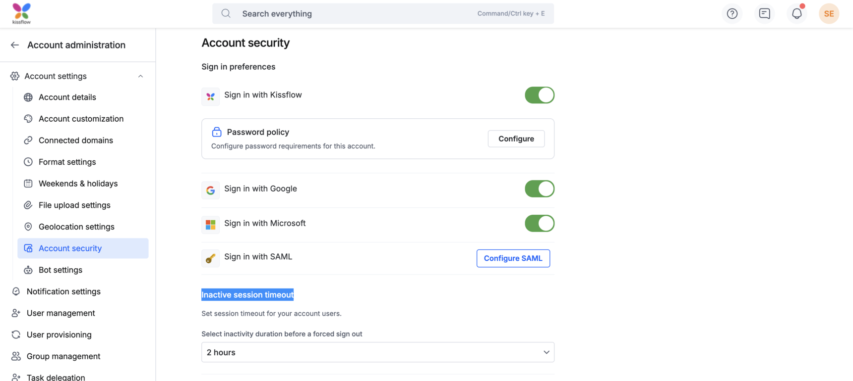 Account admins can now control the inactive session timeout, allowing you to set how long a user can remain inactive before a forced sign-out. Earlier, the timeout was fixed at 24 hours—now you can customize it.