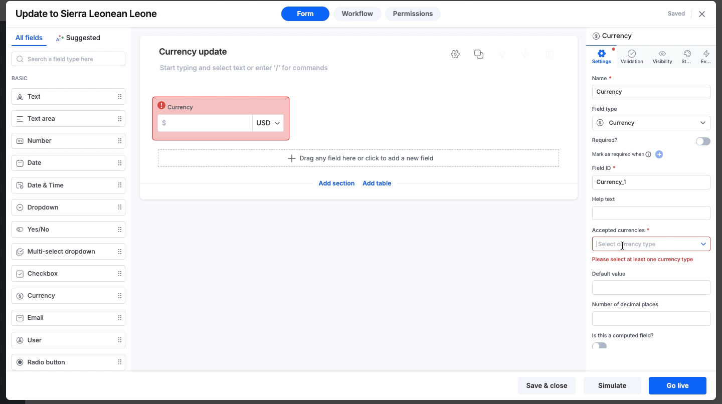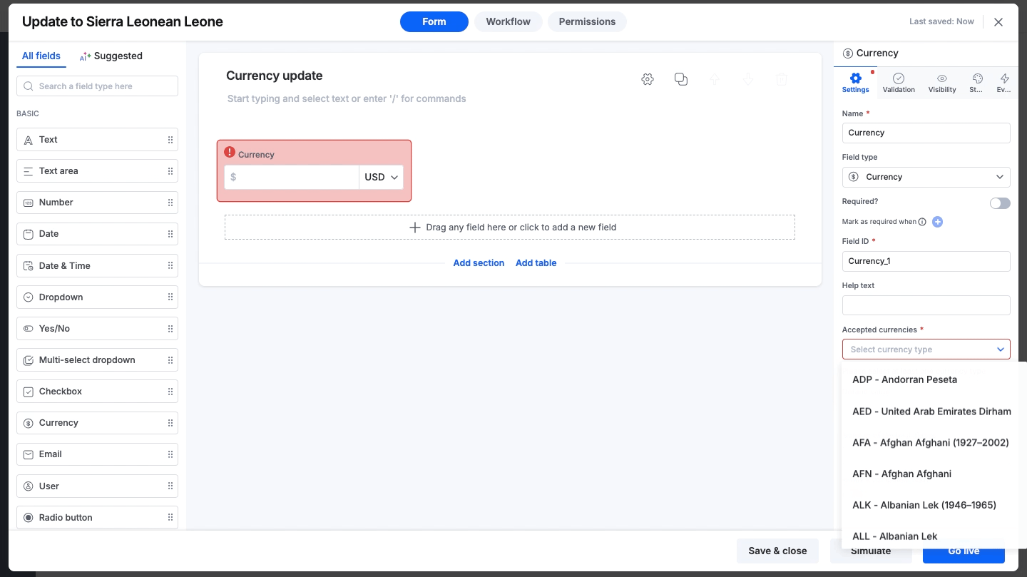We've updated the Currency field in Kissflow Forms to support the new Sierra Leonean Leone (SLE), reflecting the country's 2022 redenomination.