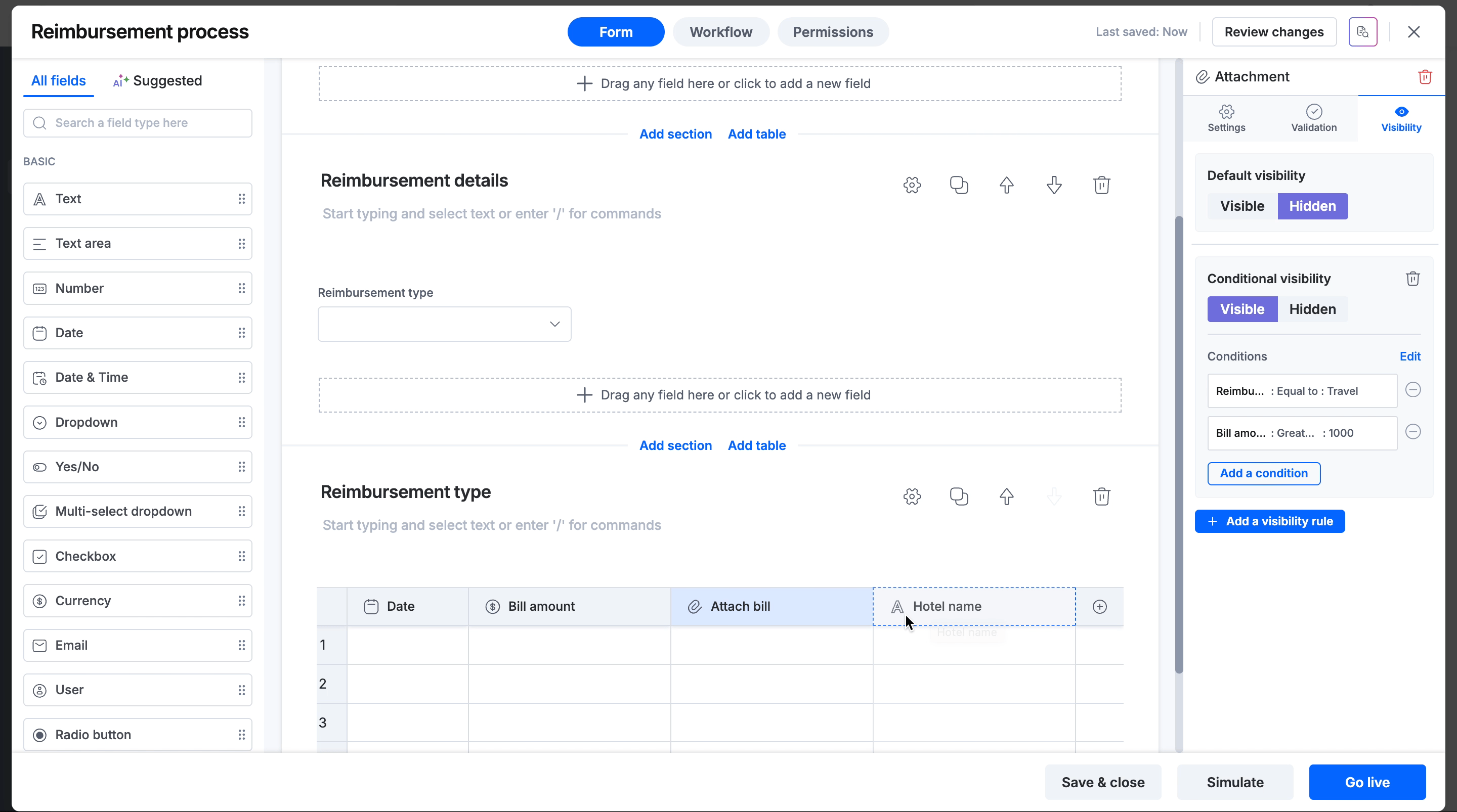 Section + table field: The condition evaluates each row individually and applies visibility per row when the condition is satisfied. For example, to show the Attach bill field only for travel expenses exceeding $1,000: