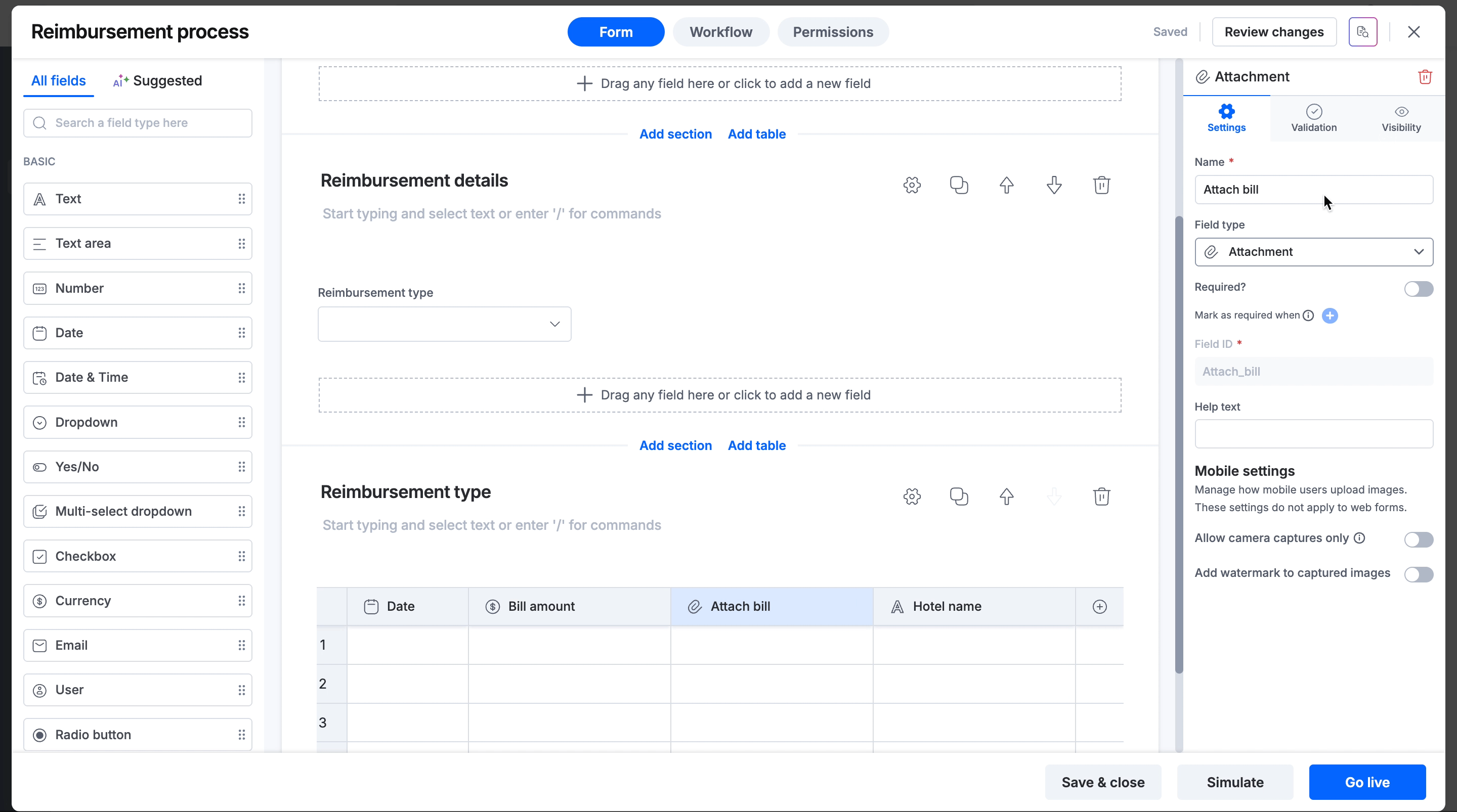 Select the Attach bill field in your table.
