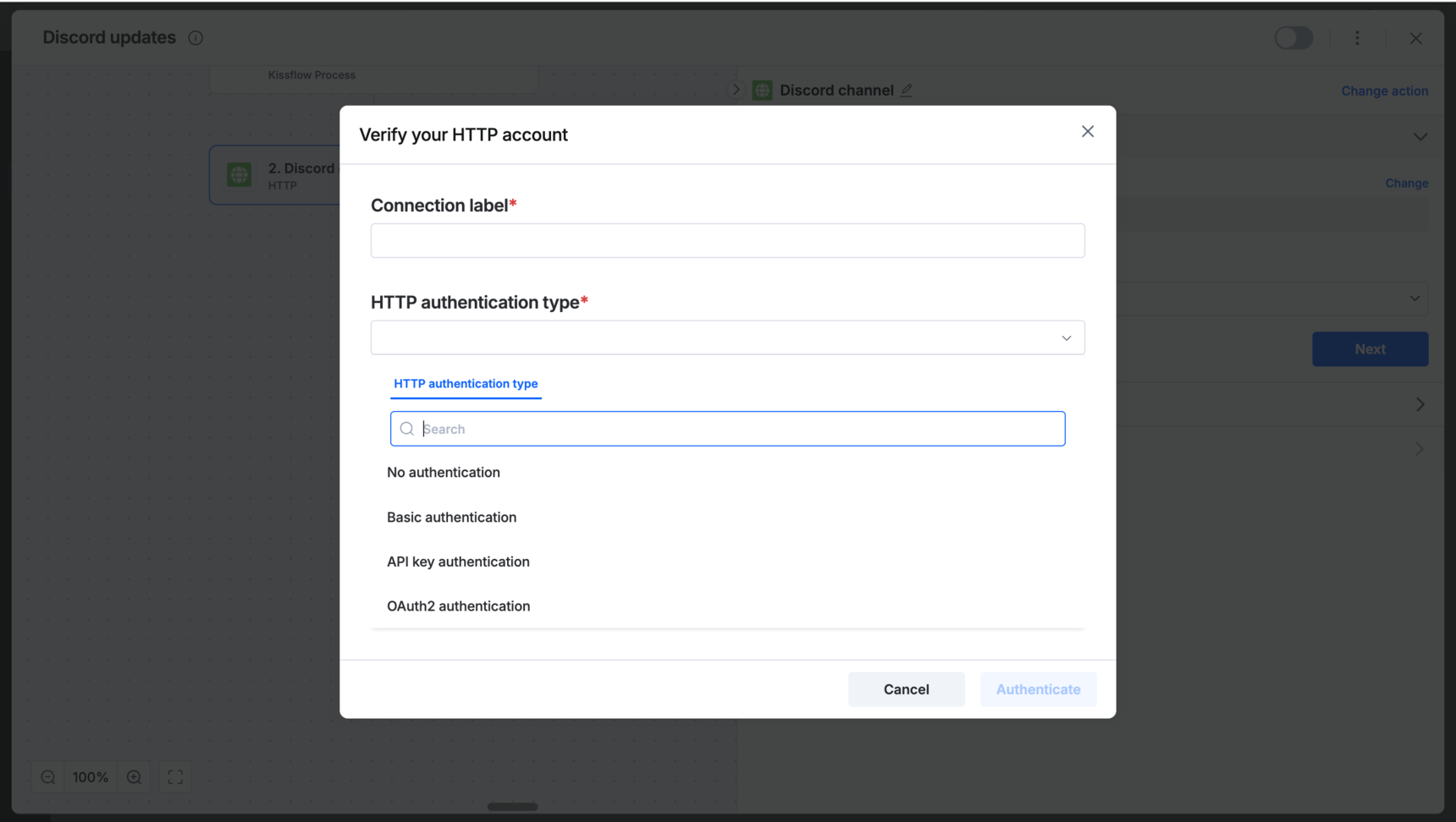 To allow Kissflow to communicate with the external app, choose one of three authentication methods: