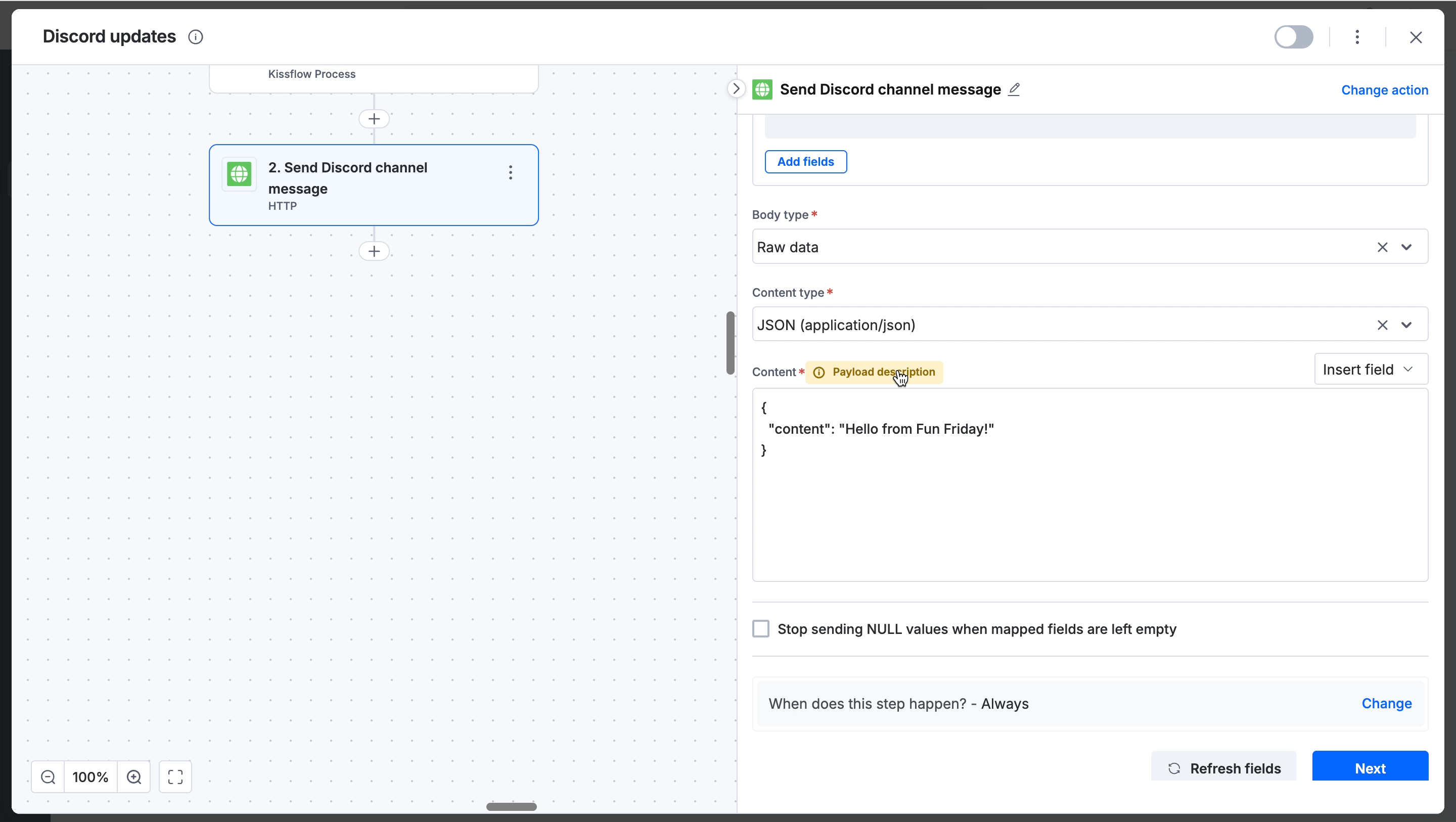 Click the Payload description badge next to Content to view a reference guide. This guide details the field names, data types (like string, integer, boolean), and examples needed to format your request correctly.