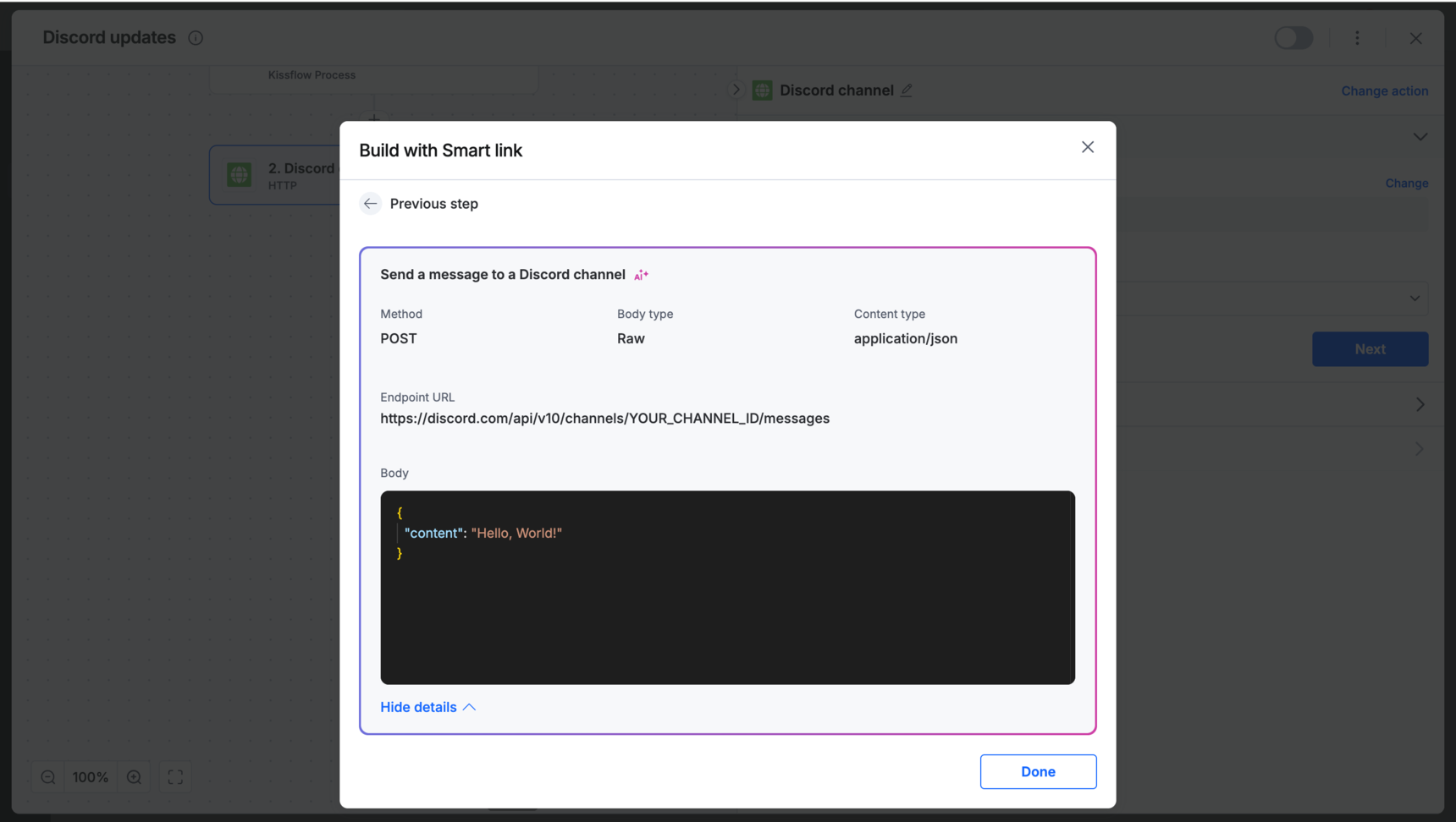 You can select Show request details to review advanced headers or parameters. Click Done to add this as an HTTP action step.