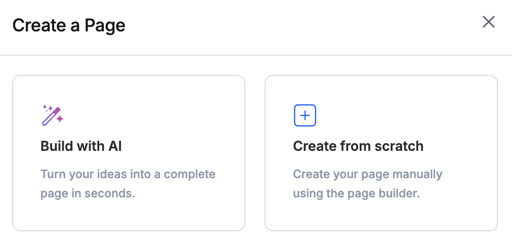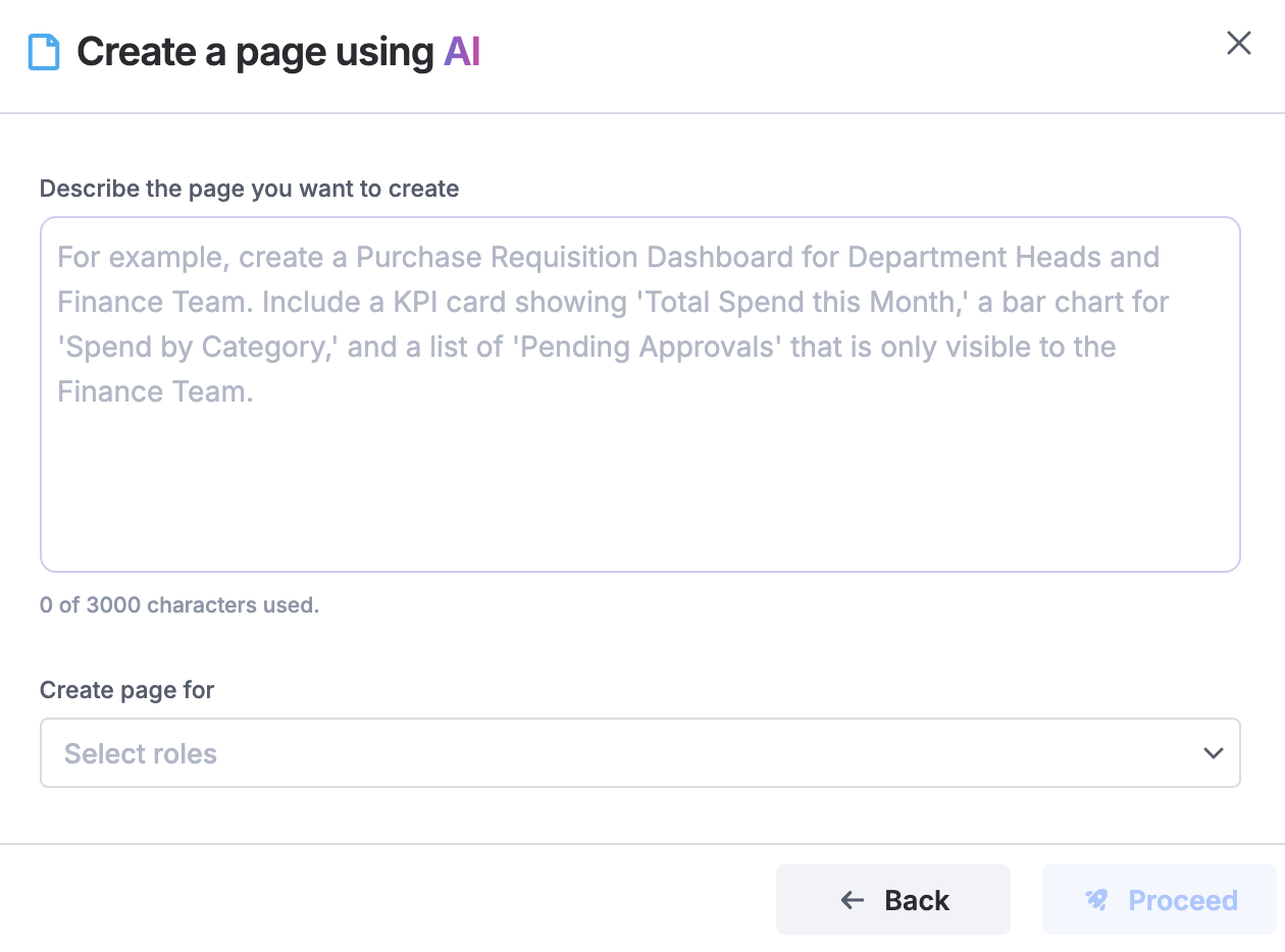 - To create a page using AI, click Build with AI and describe the page you want to create. Then, select the roles the page is intended for from the dropdown below. Choosing roles is required. You can choose multiple roles, if needed.