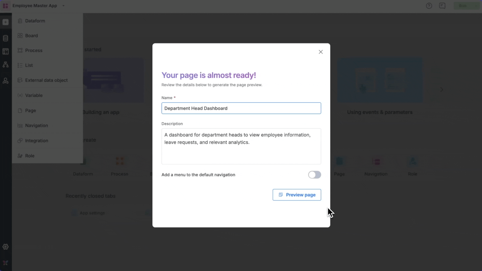 AI does not create new workflows, forms, or reports. It only assembles content that already exists in your app. If your app has limited or no relevant workflows, the generated page may be limited or may not be created. To ensure the best results, please make sure your app includes meaningful forms, views, reports, and other relevant workflows and that they are shared with the roles for which you are creating the page.