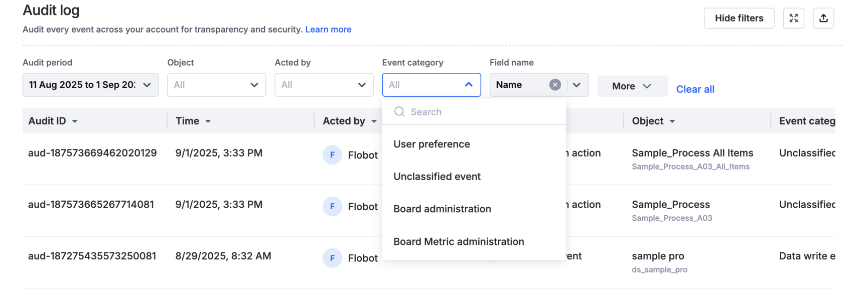 - Event category: Filtering events based on Event category is a recommended way to get specific events from the Audit log. If you are unsure how to go with the event category, enter a flow name like process or board in its search bar, and it will list all the categories relevant to the entry.
