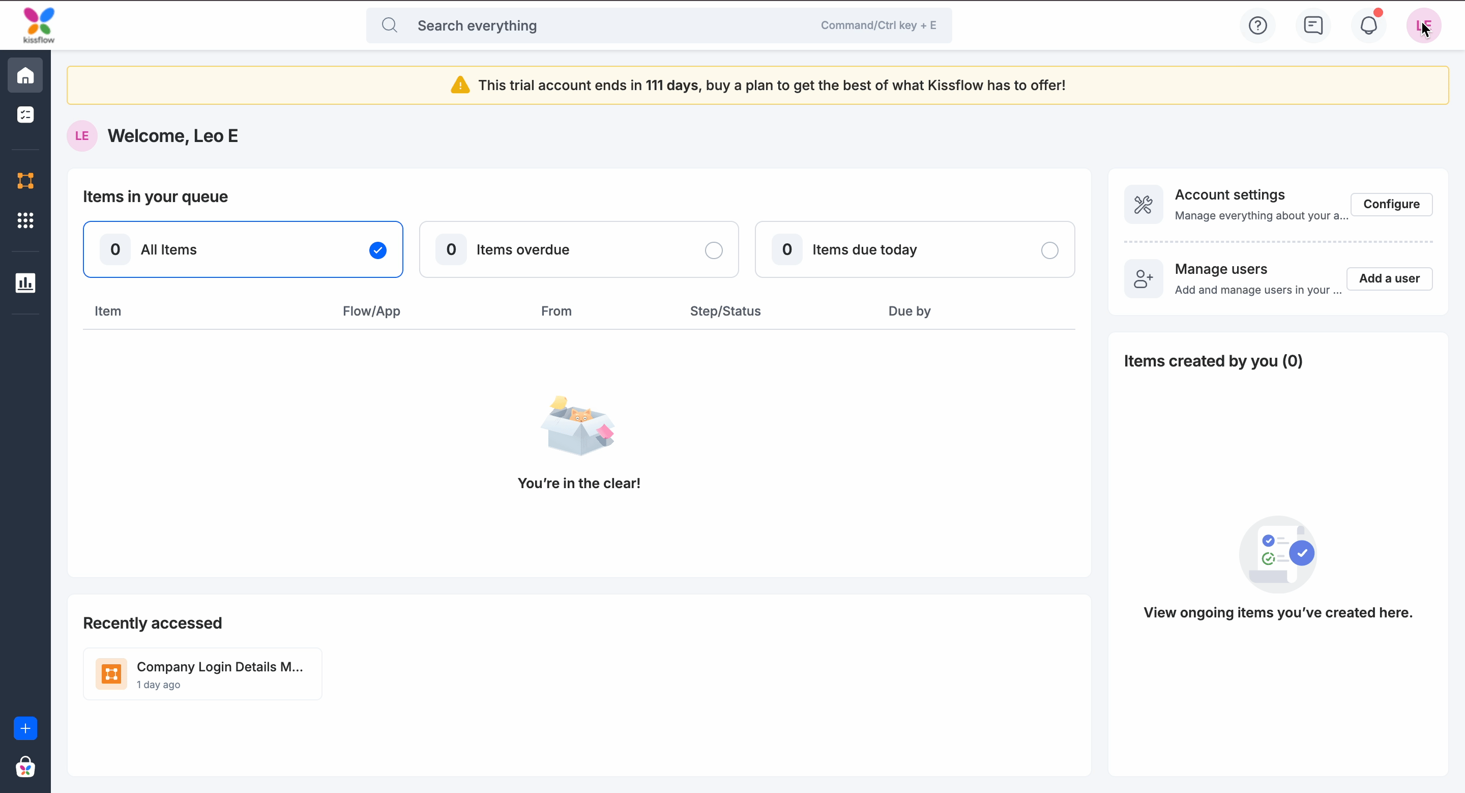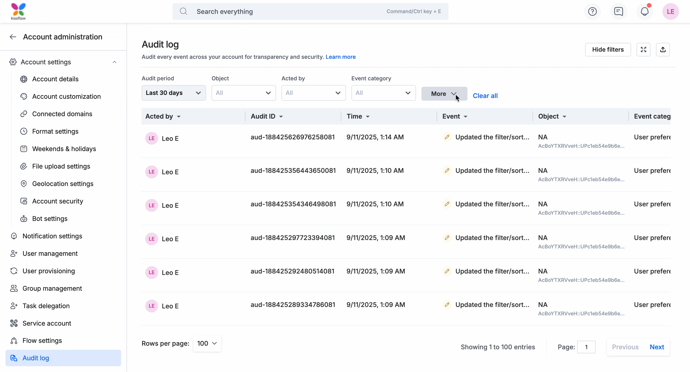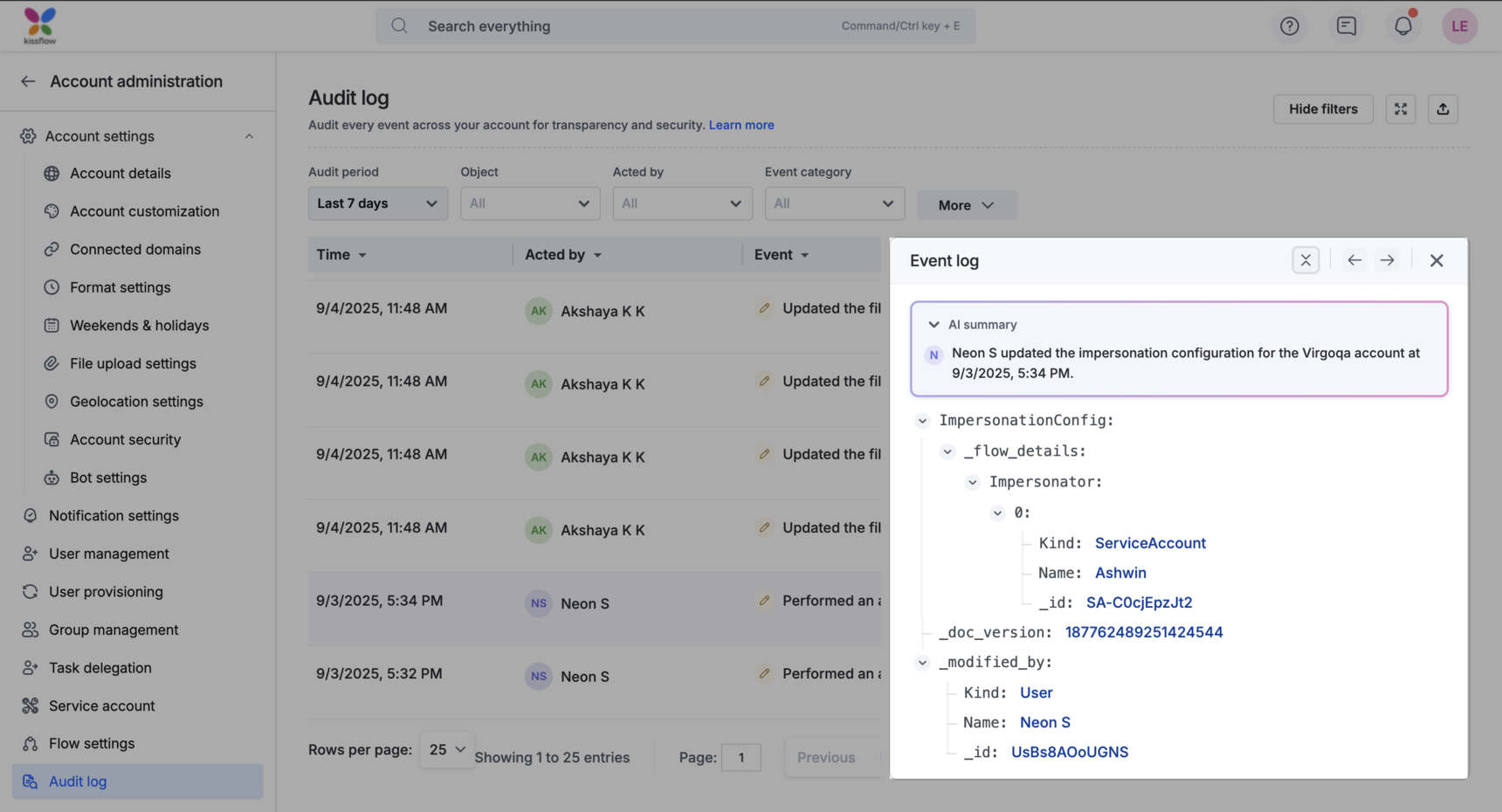 The audit log is a centralized record of all activities that take place in your Kissflow account. It helps administrators track who did what, when, and from where by capturing events across your account, such as, user activity, security-related events or changes made to account settings and flows.
