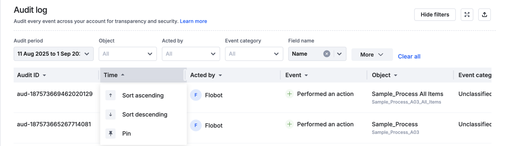 When you click Show filters, additional filtering options appear, letting you narrow down the audit log results. You can hide the filter panel anytime by selecting Hide filters, to keep the focus back on the log entries.