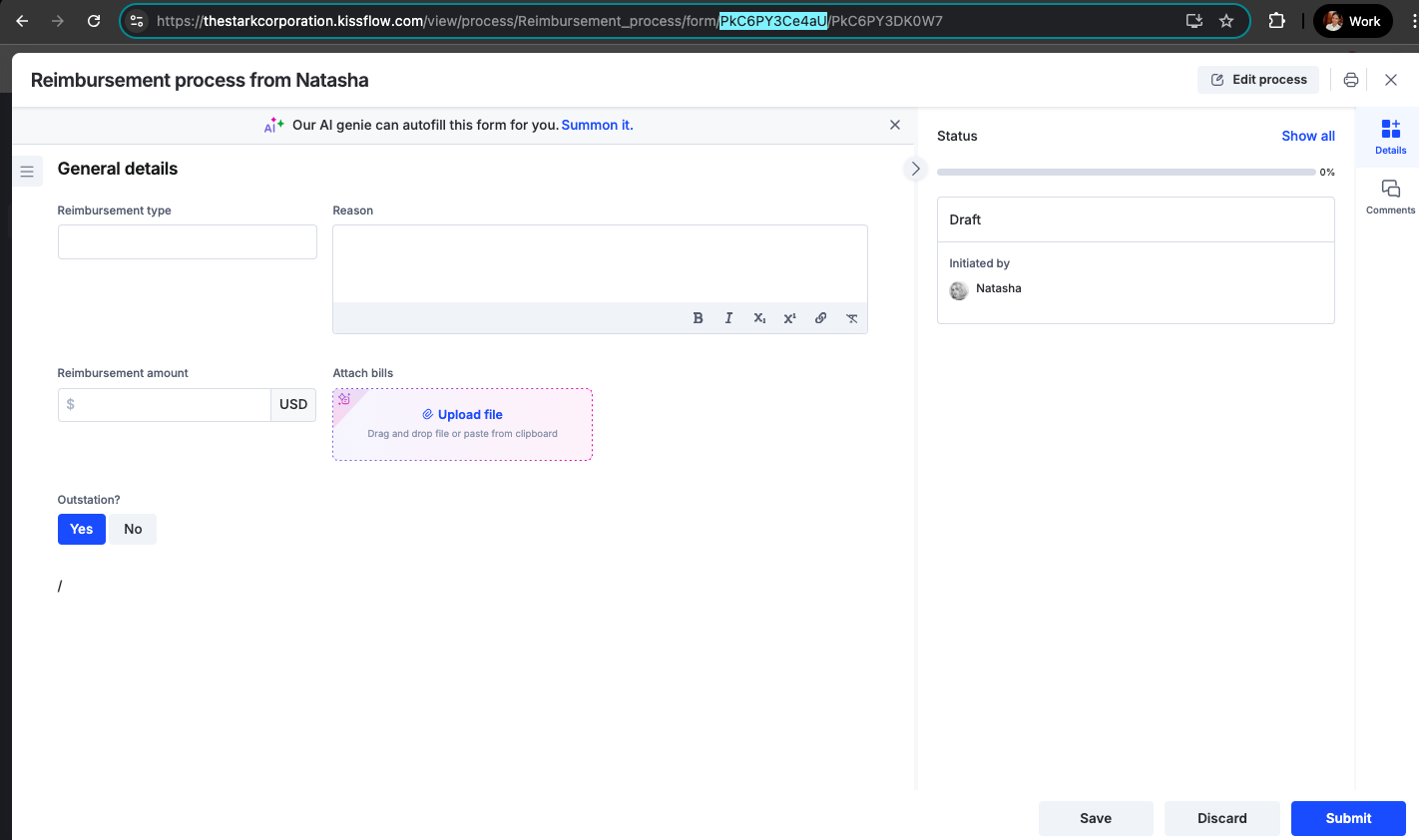 For actions that involve updating an existing item, youβll need to specify the Instance ID. Use the Instance ID from the processβs URL, and ensure that the request is in In Progress status. - Test whether your action step is set up correctly by clicking the Test action button. The connector will pull field data from your process and display it in JSON format. Errors, if any, are notified to you right away. Fix them before retesting the action.