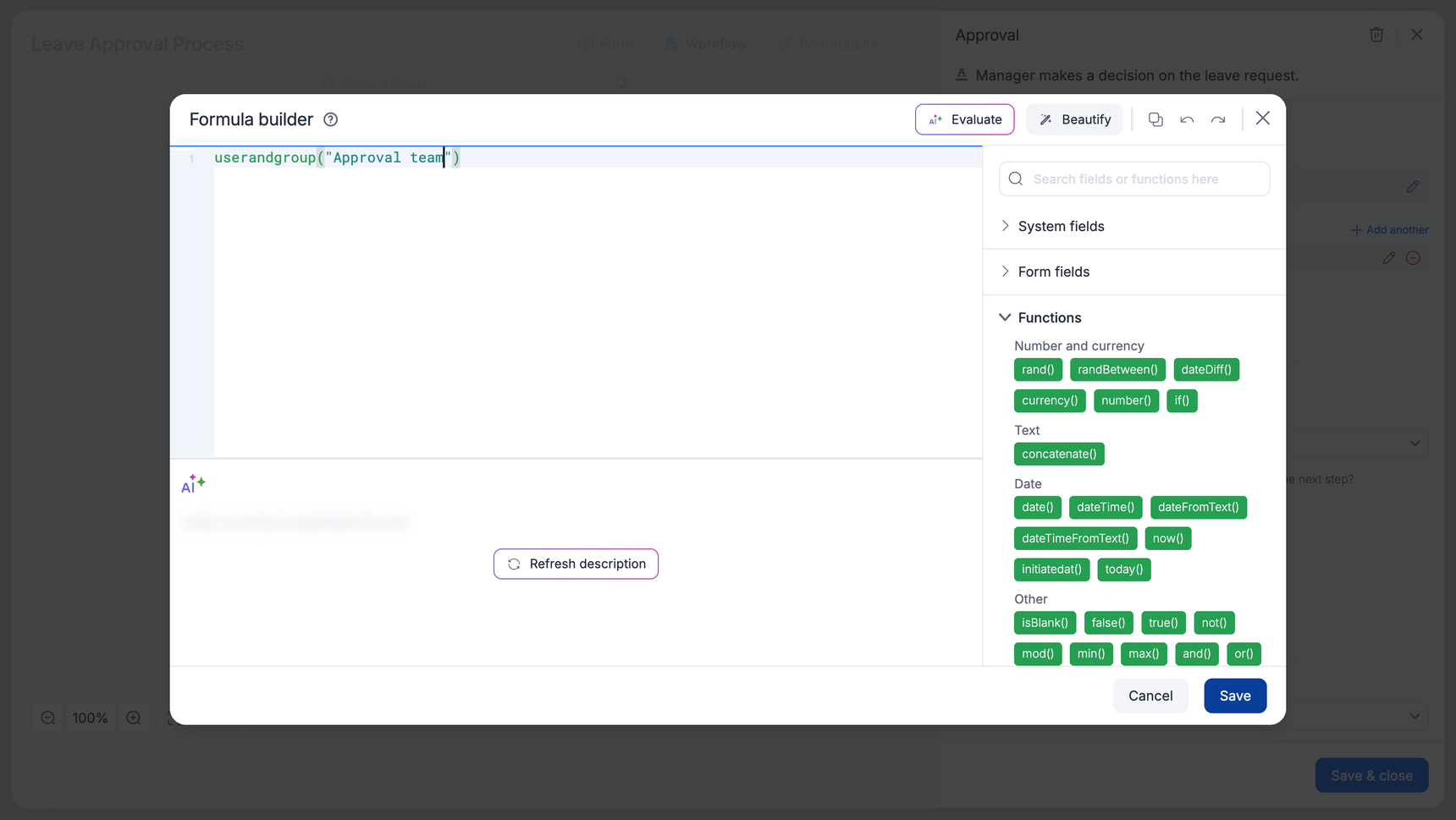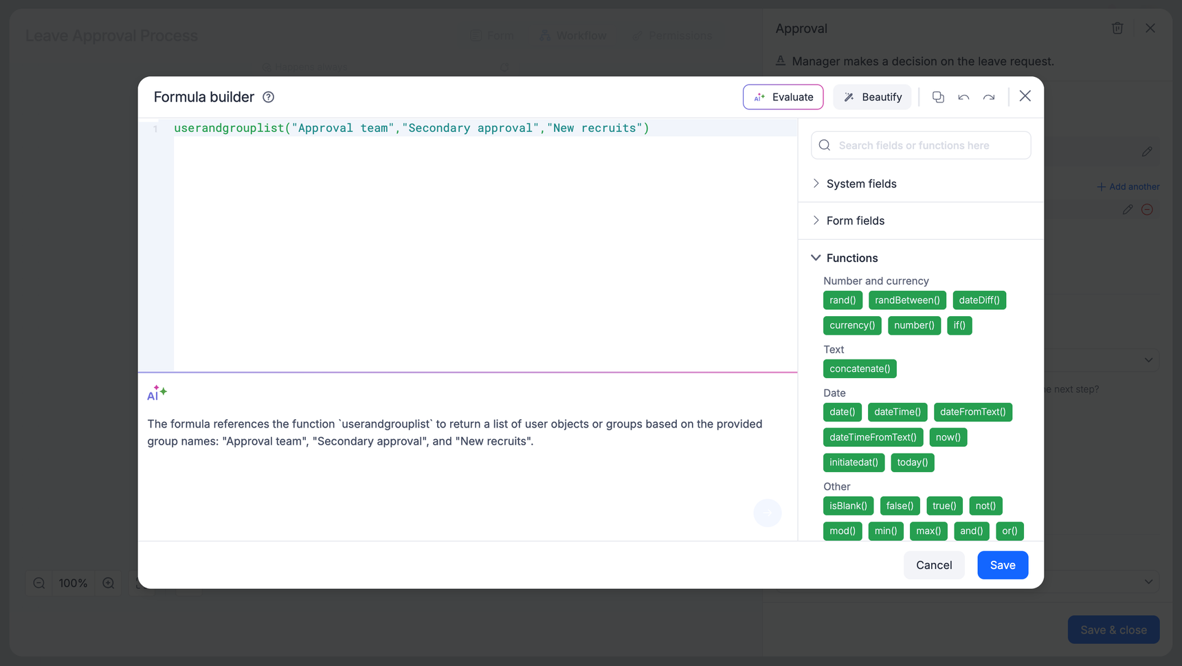 userandgrouplist(“Approval team”, “Secondary approval”, “New recruits”) will assign the step to the Finance team, HR team, and the New Recruits batch in one go.