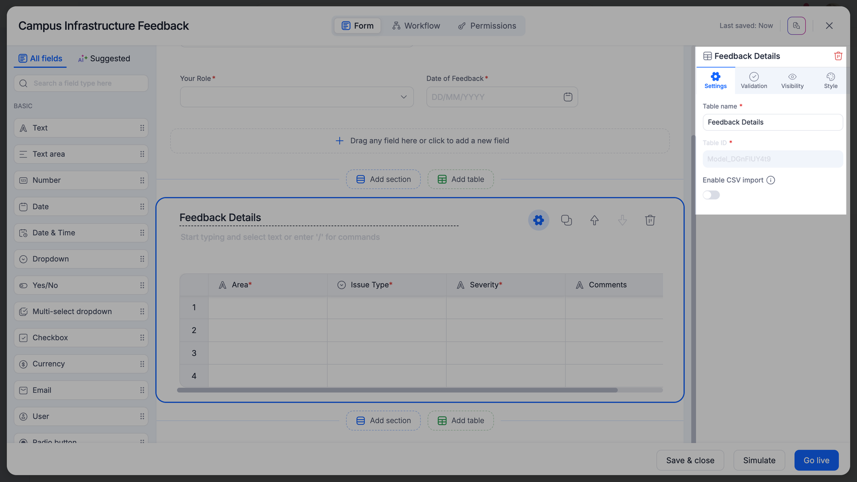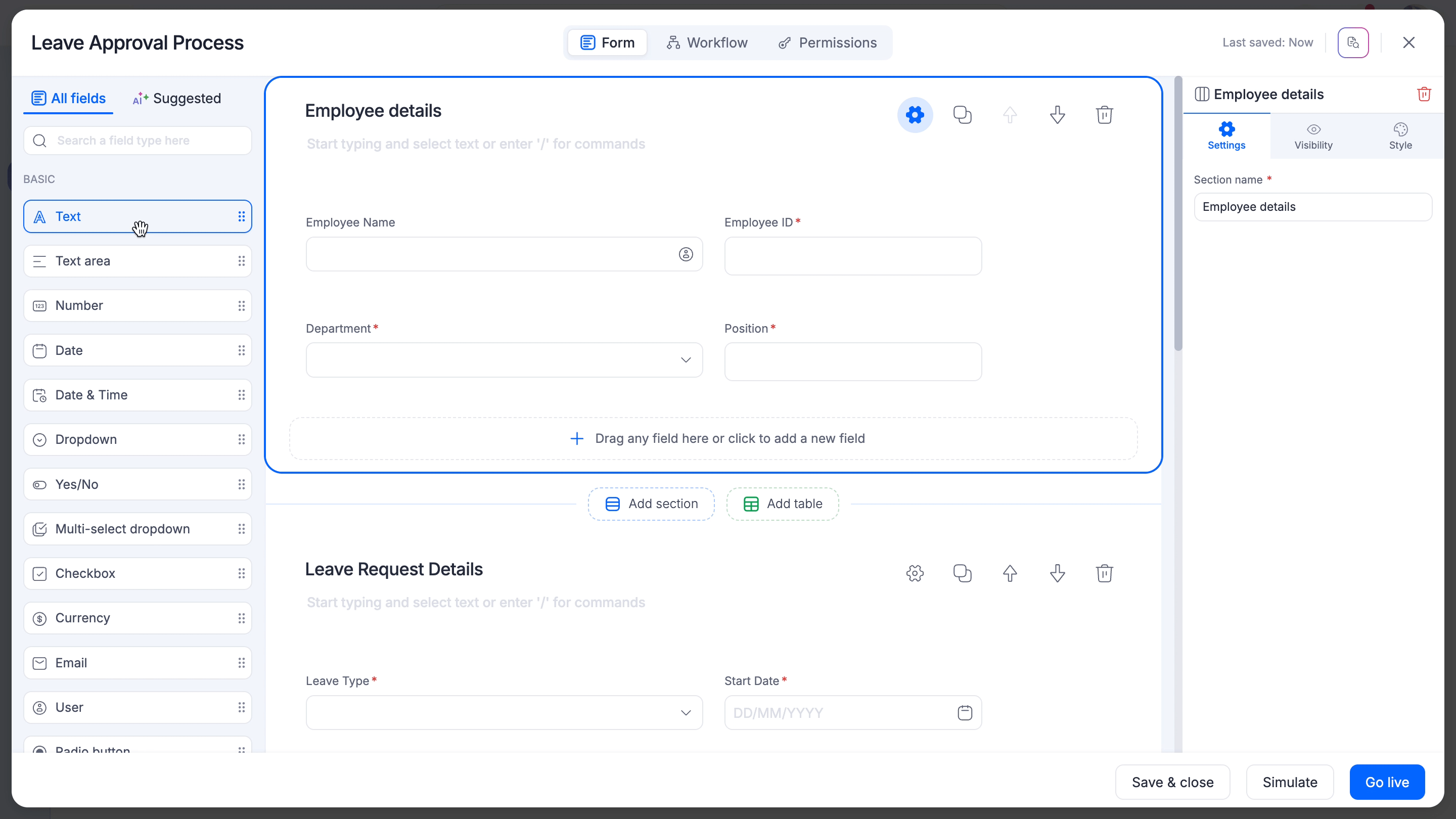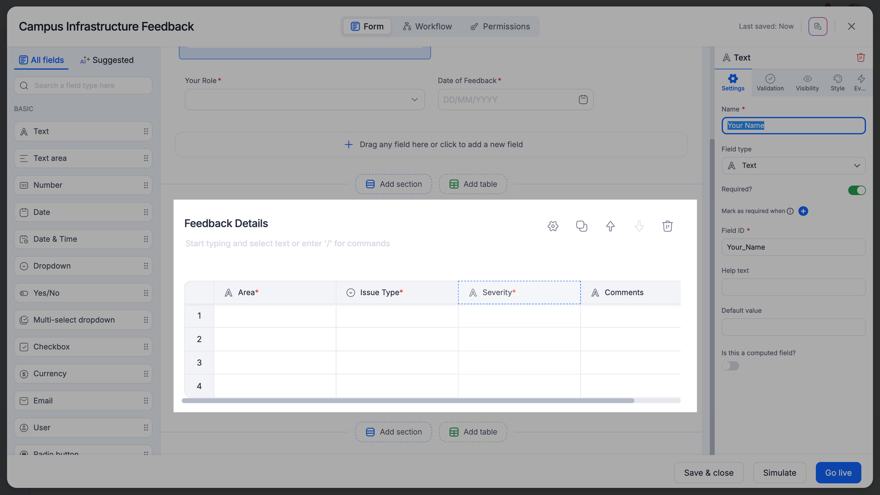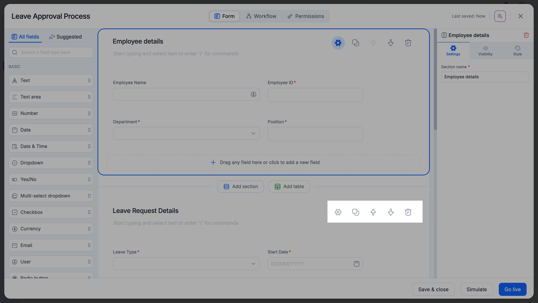 A form is an entity where you can collect input from the people participating in your workflow. Forms are used in processes and boards in Kissflow. A form has three primary components - section, field, and table.