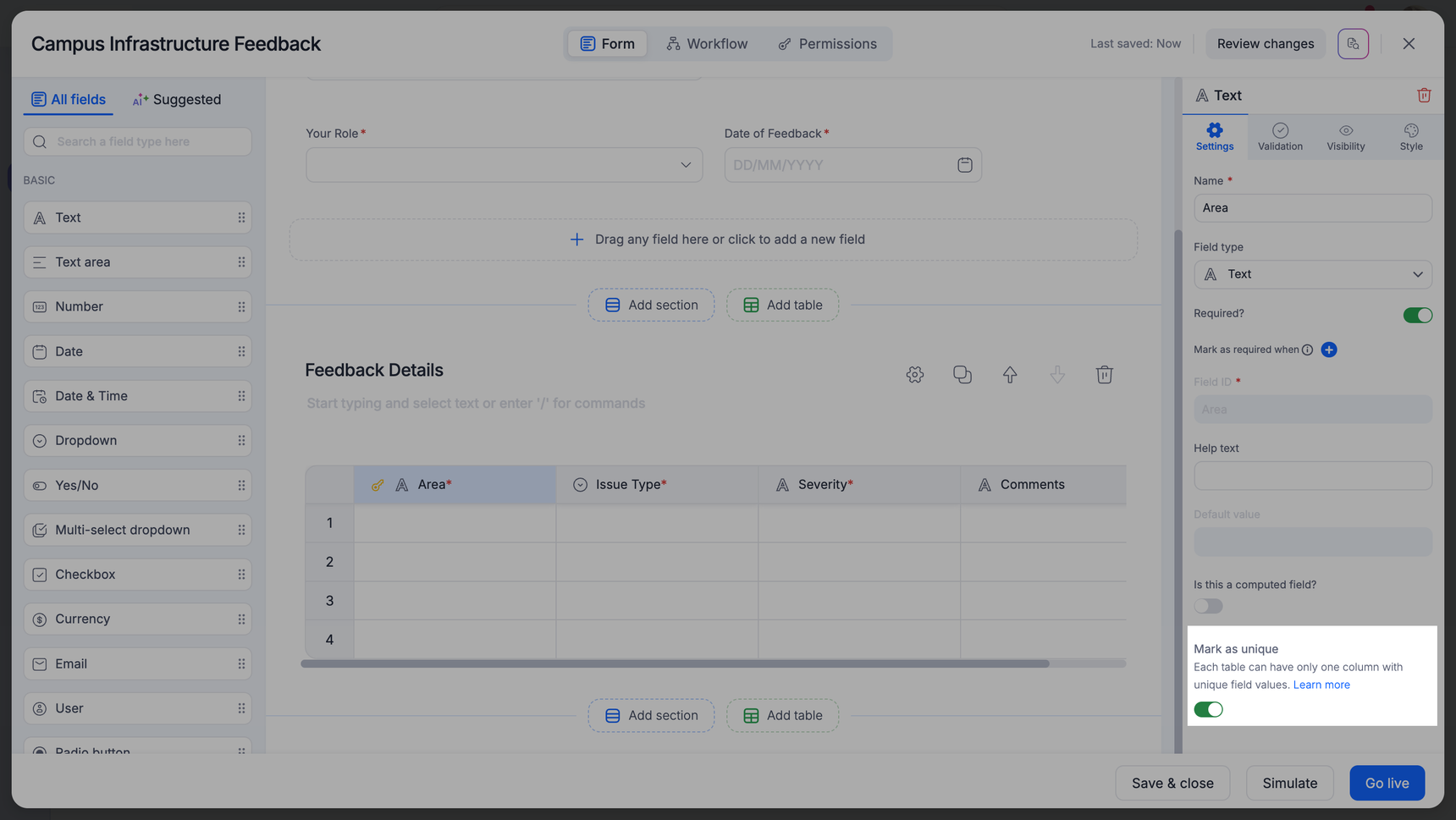 To designate a field as unique, select it and turn on Mark as unique from the right-hand field properties panel.