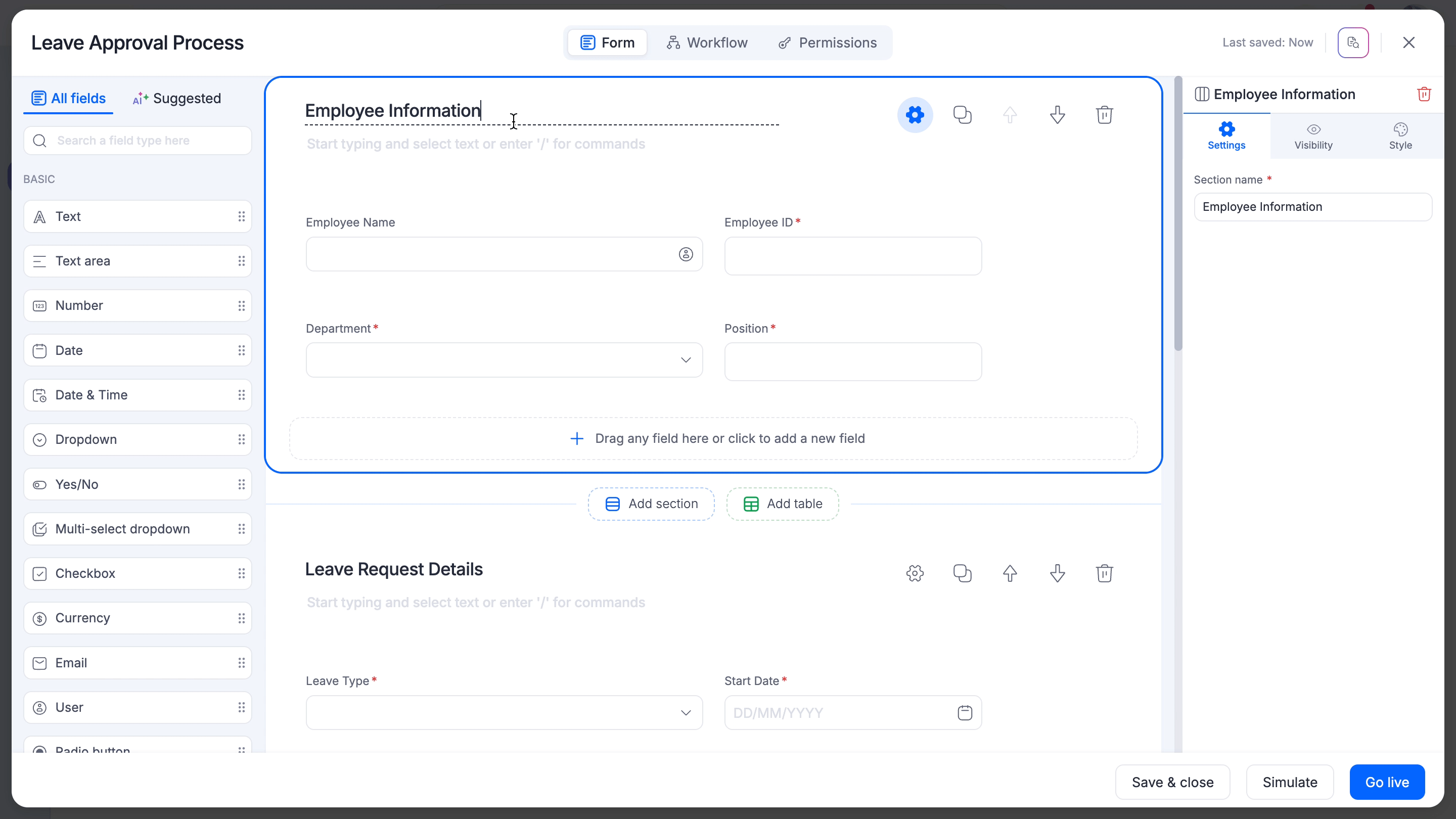 For example, when you create a process workflow to streamline the hiring processes in your organization, a typical form in your hiring process will require a section named "Candidate information" to collect and store information about the candidates who will go through the hiring process. The fields that can be placed in the Candidate information section are First name, Last name, Work experience, Employment type, etc.,