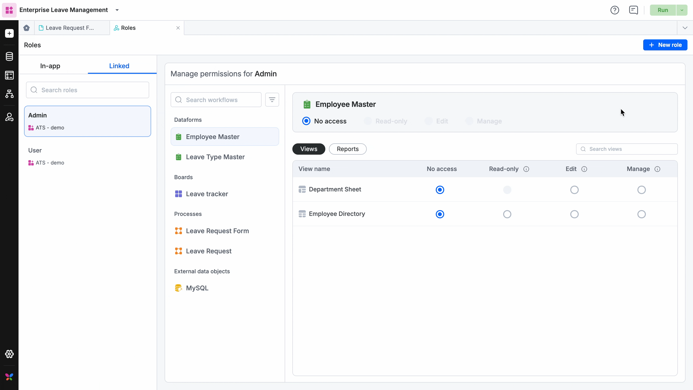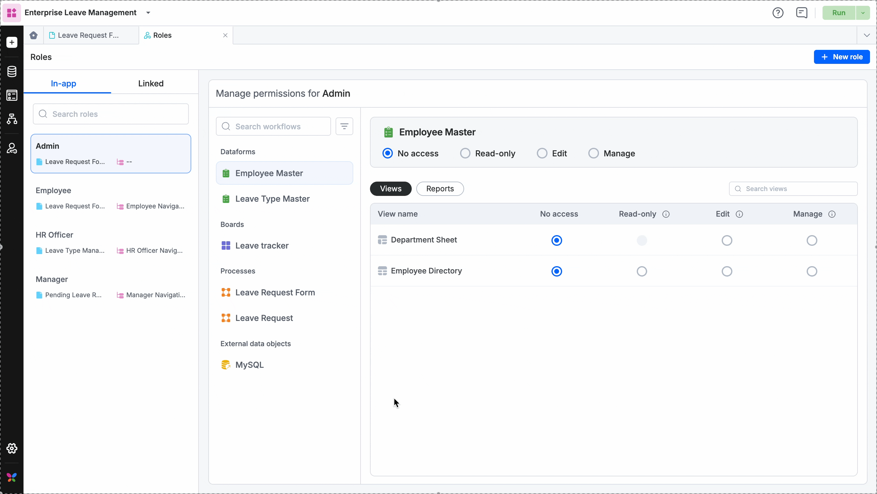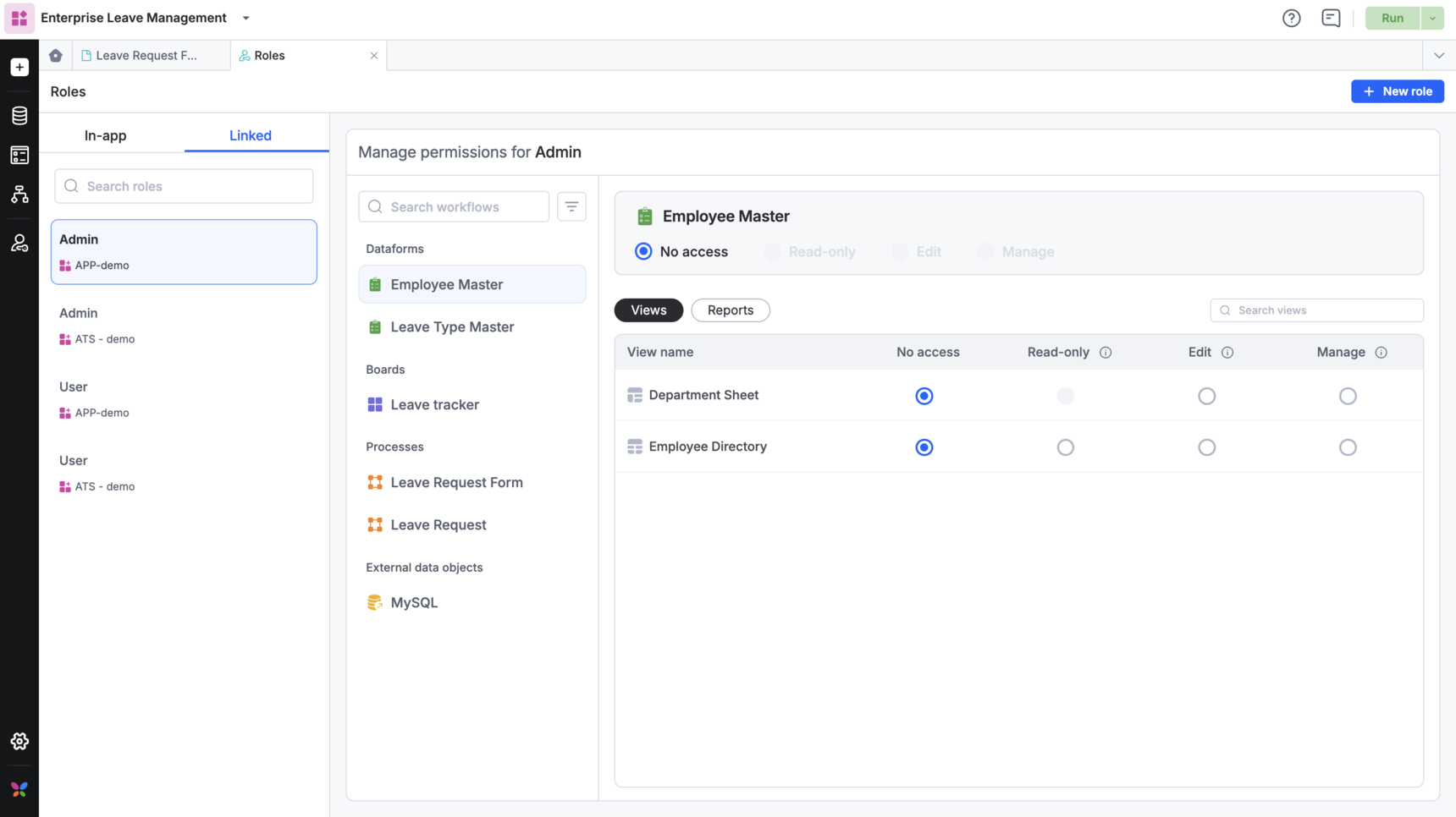 You can manage permissions for both in-app and linked roles from this tab. On the right, you will find all the workflows in your app and their corresponding child flows, such as views and reports. Using radio buttons, you can share main workflows such as dataforms, boards, processes, and the views and reports right from this page.