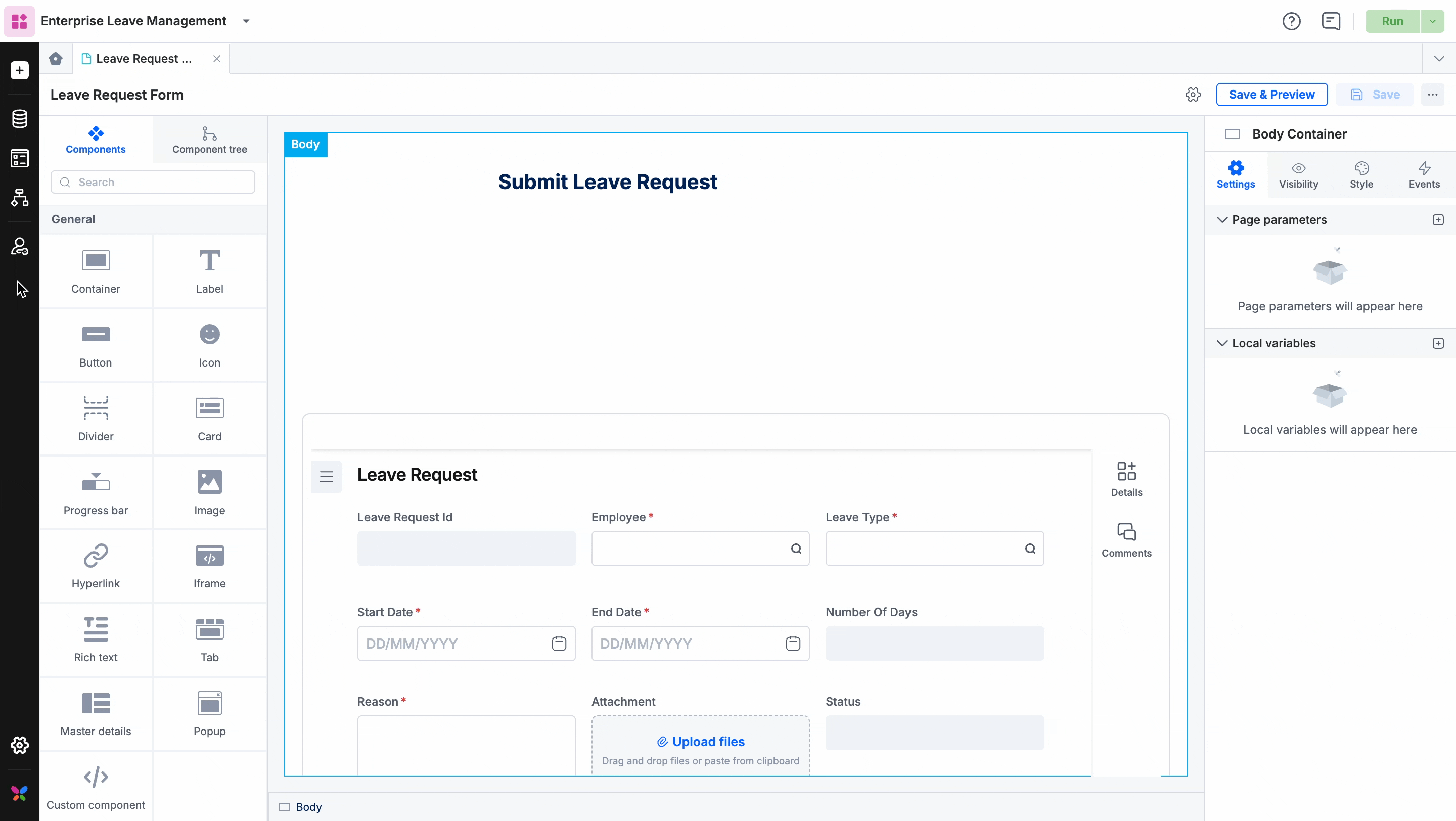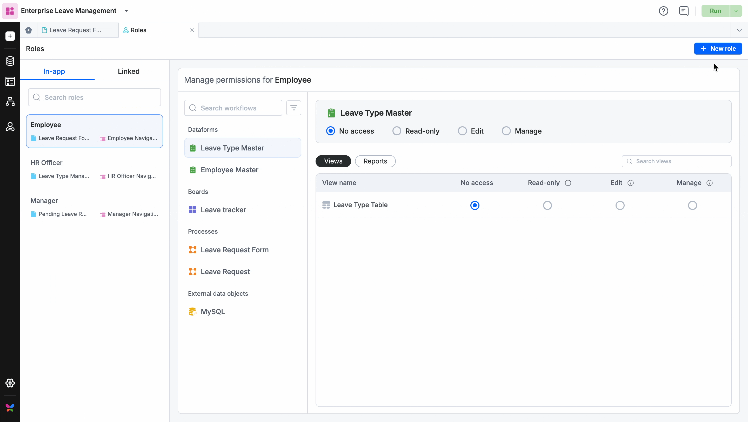Inside the app builder, click the Roles option on the left navigation bar. You can create an in-app role or link a role from an external app.