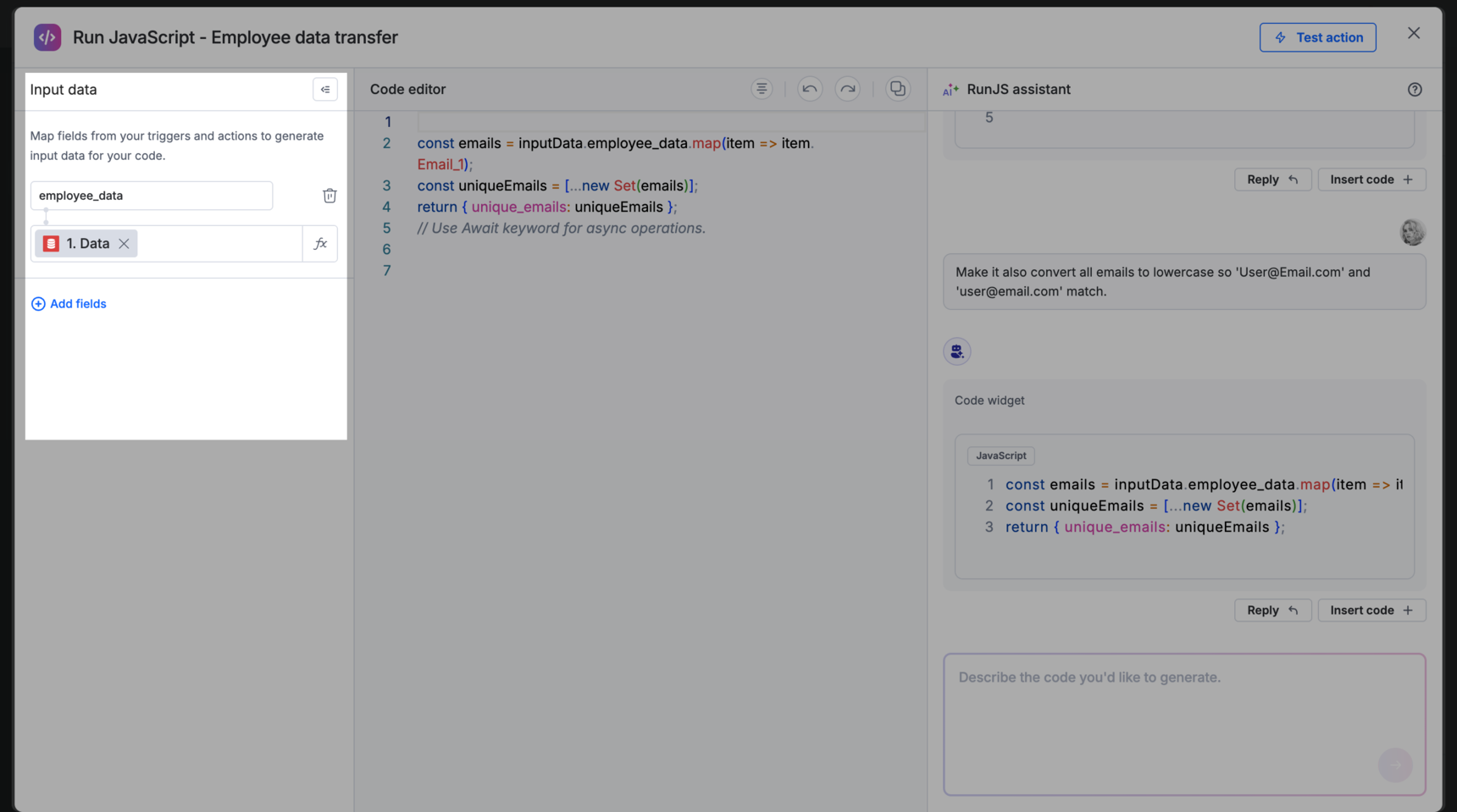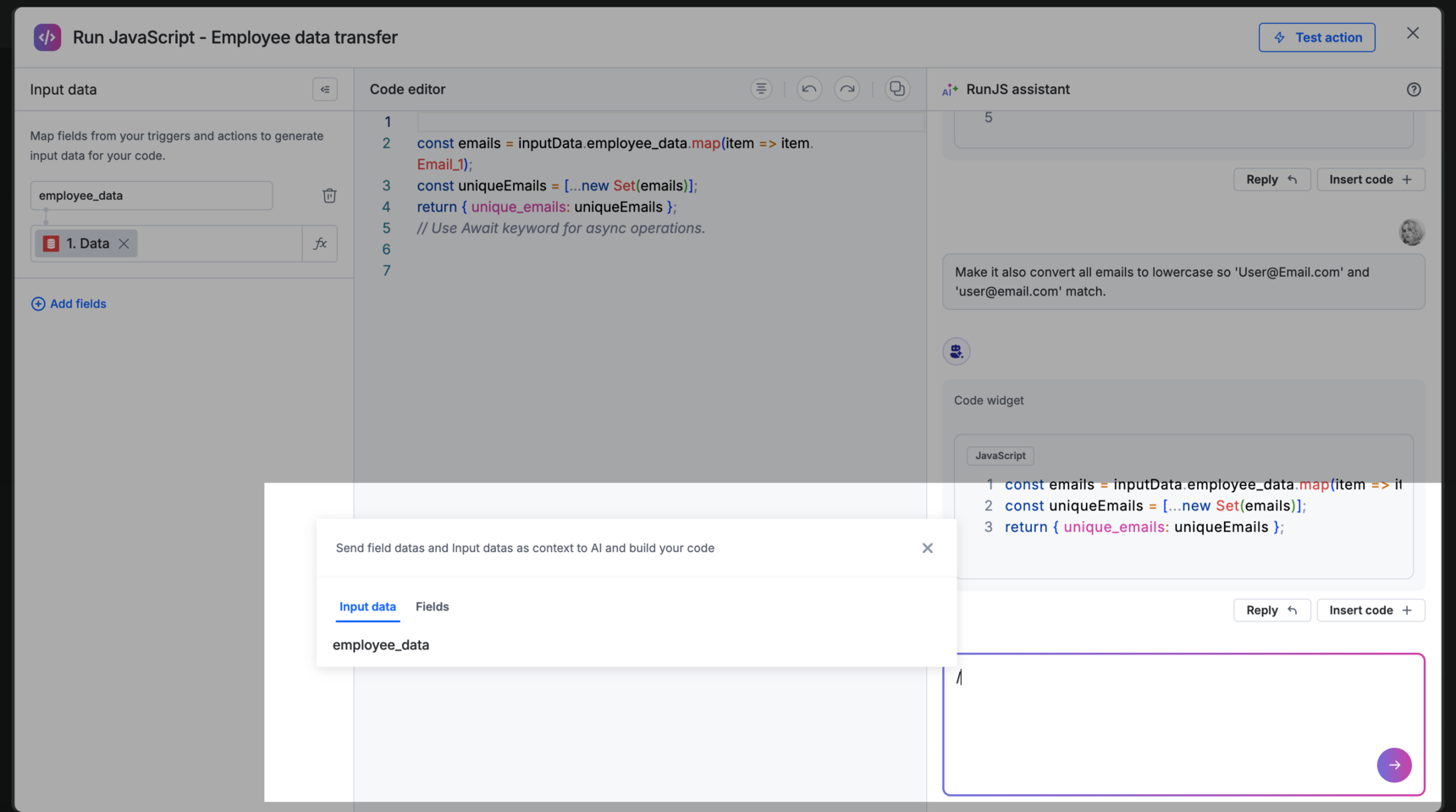 The code will be pulled into the RunJS assistant chat. Type your prompt (For example, Refine this code so that it also converts all email addresses to lowercase before deduplicating, ensuring 'User@Email.com' and 'user@email.com' are treated as the same) to modify it.