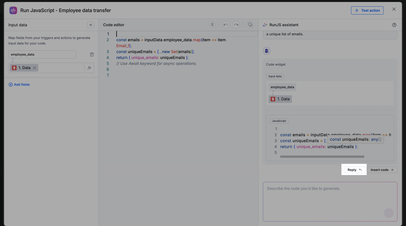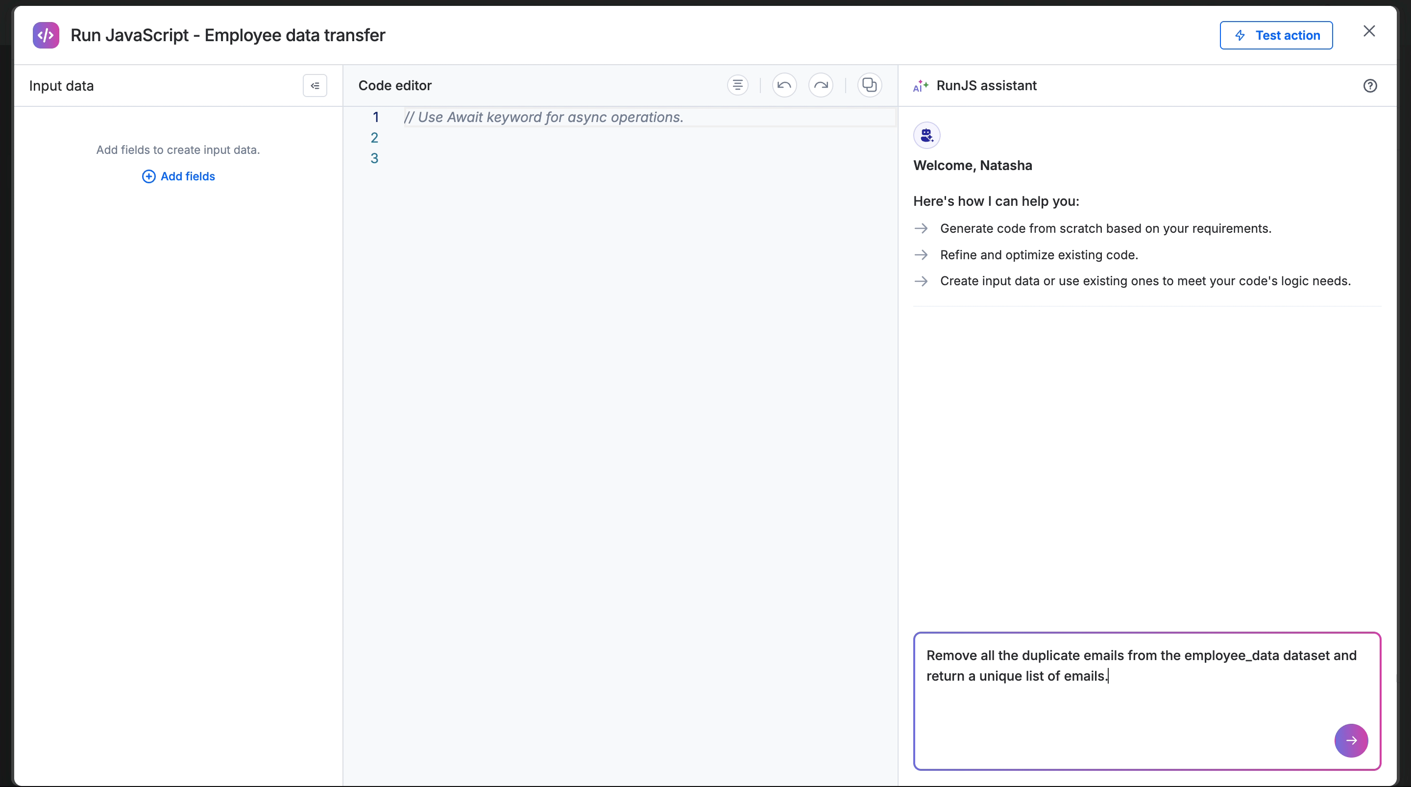 In the RunJS assistant chat on the right, describe the logic you want to achieve (For example, Remove all duplicate emails and return a unique list).