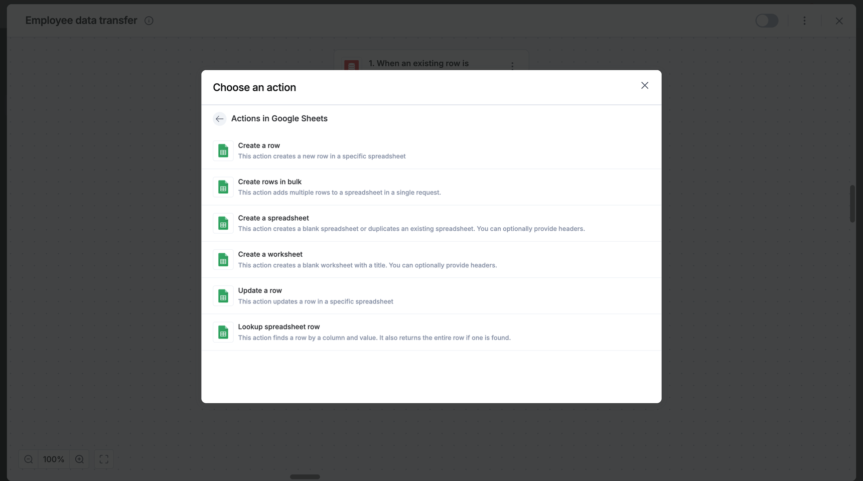 ) next to set up your action step. Search for Google Sheets and select a desired action