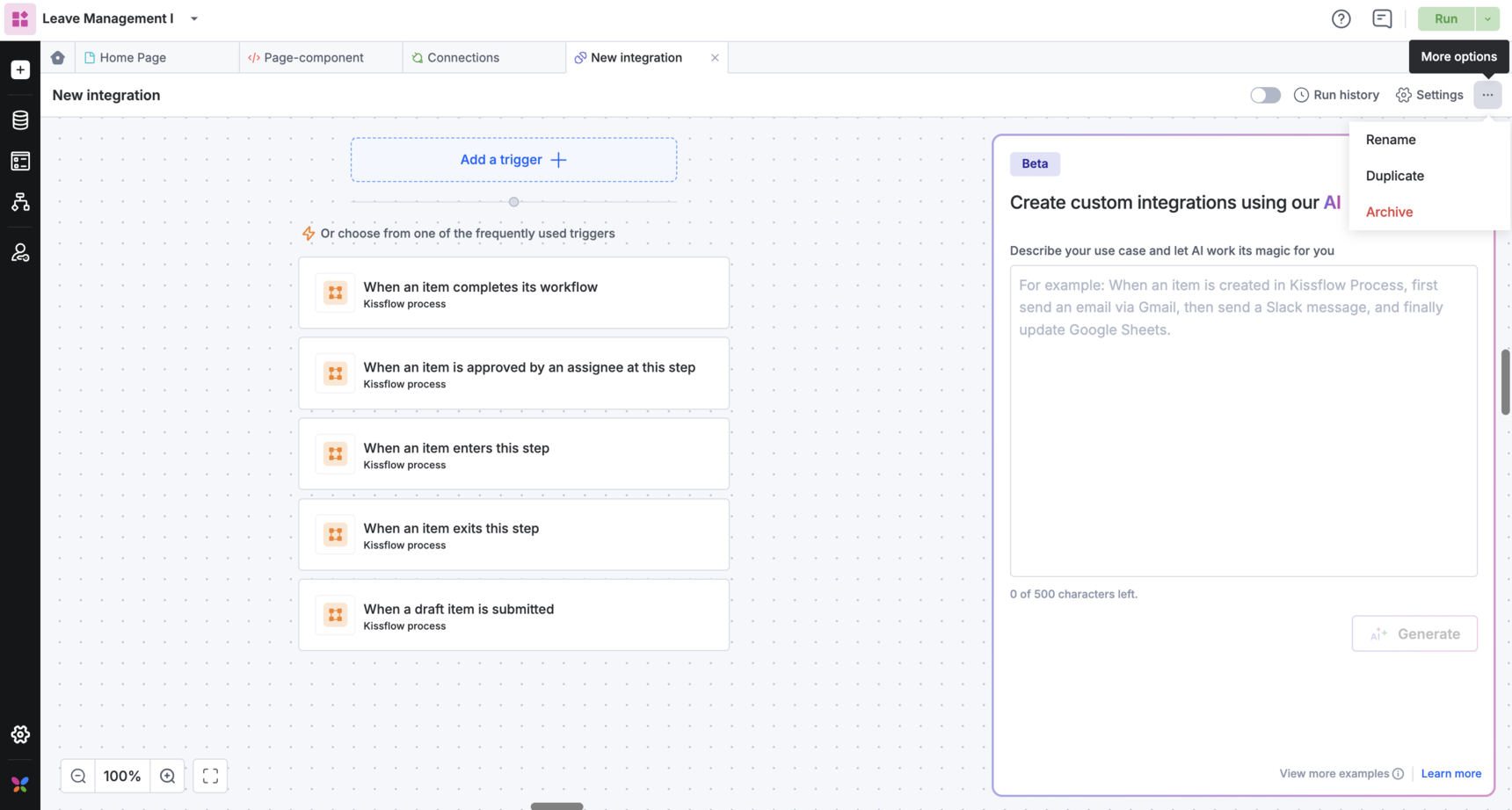 - You can edit, rename, duplicate, and archive an integration from here. Note that you must deploy the app for your changes to take effect.